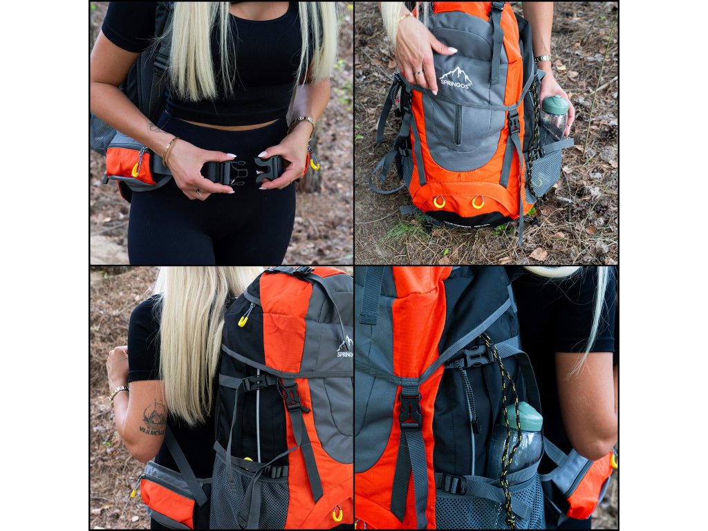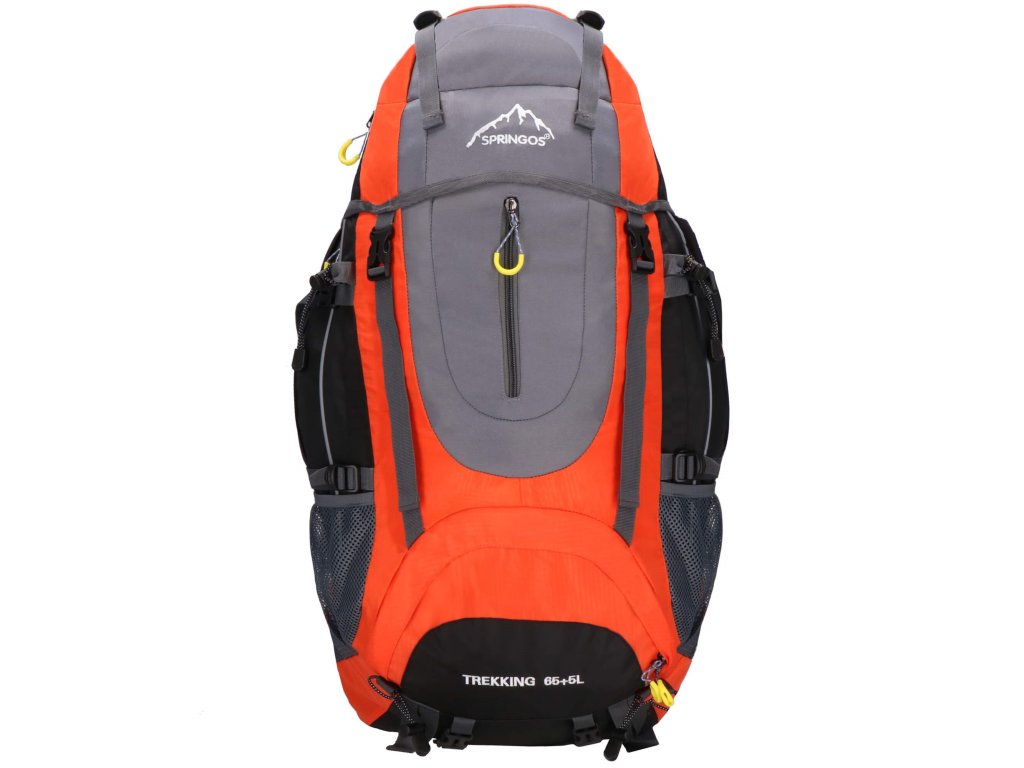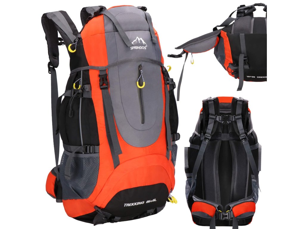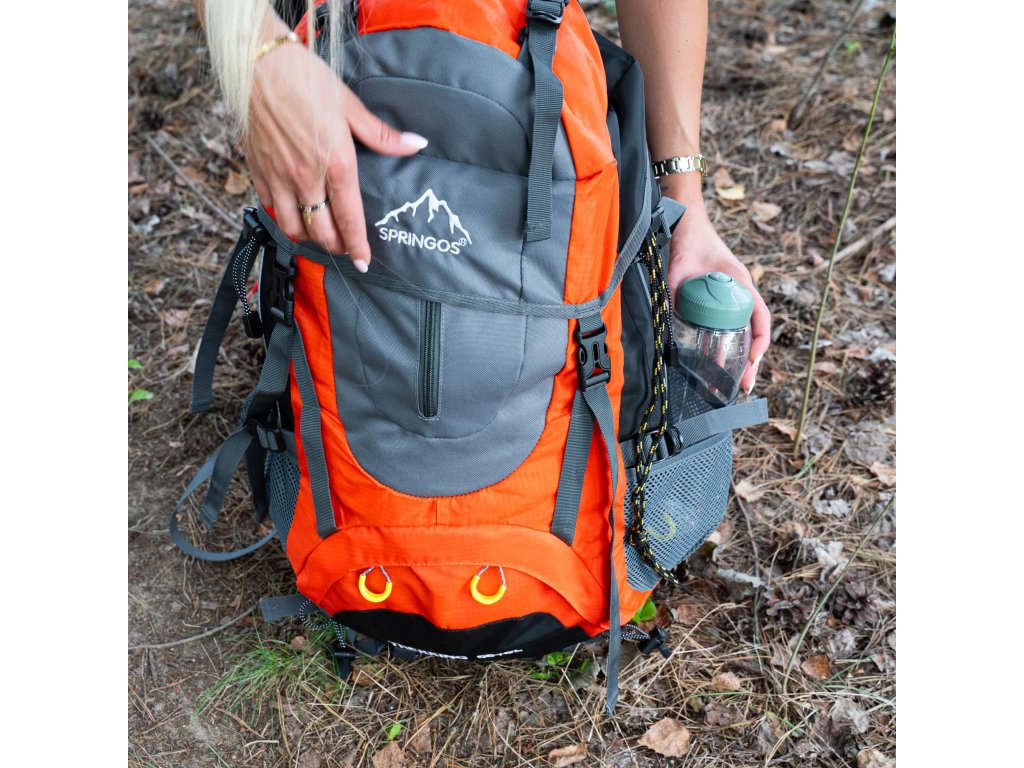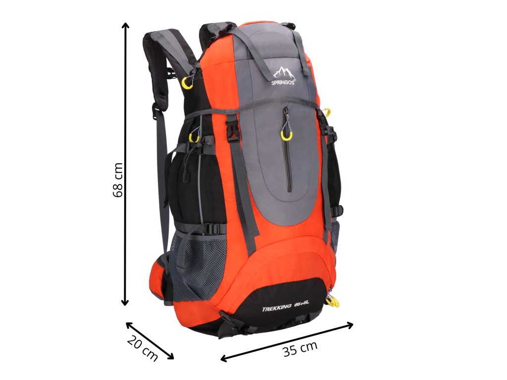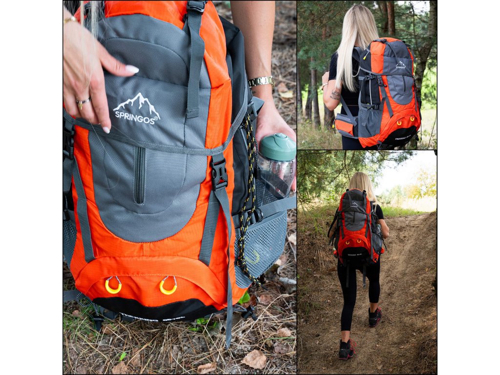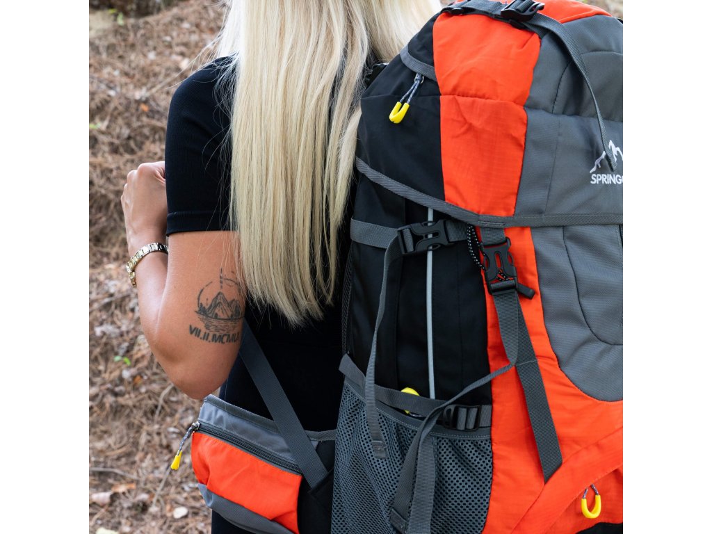 - V hornej časti vpredu klapy vyšívané biele logo Springos, v spodnej časti nápis TREKKING 65+5L.