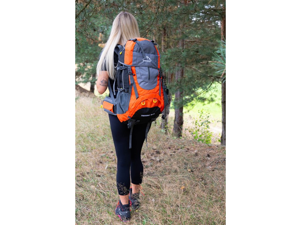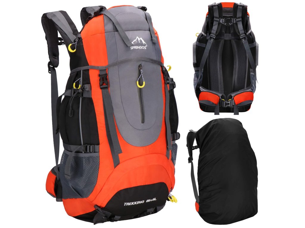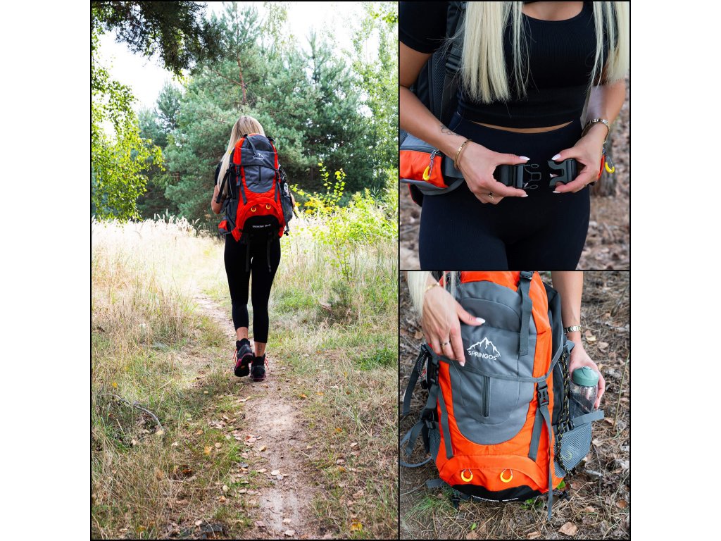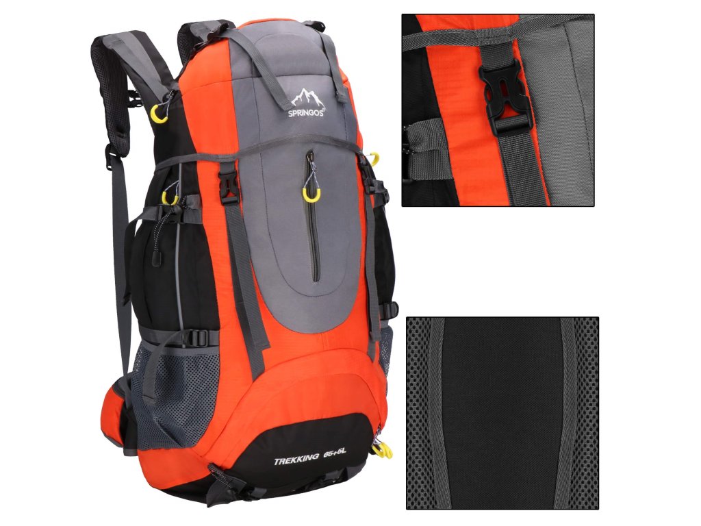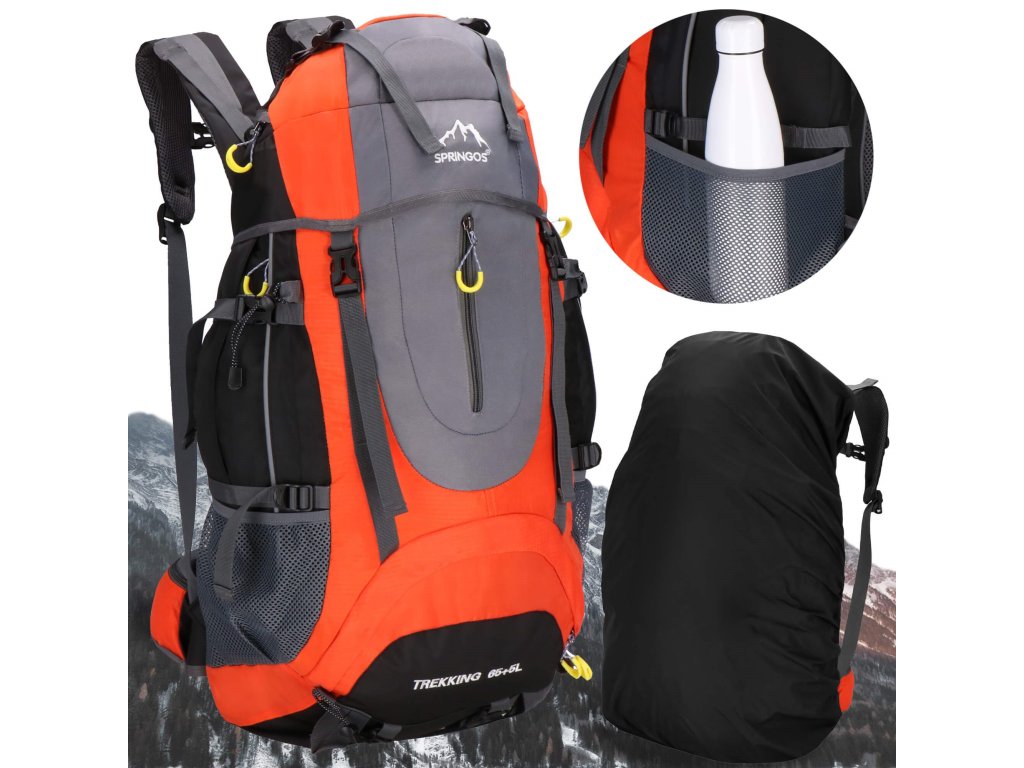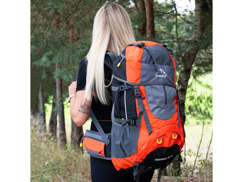 - V hornej časti vpredu klapy vyšívané biele logo Springos, v spodnej časti nápis TREKKING 65+5L.