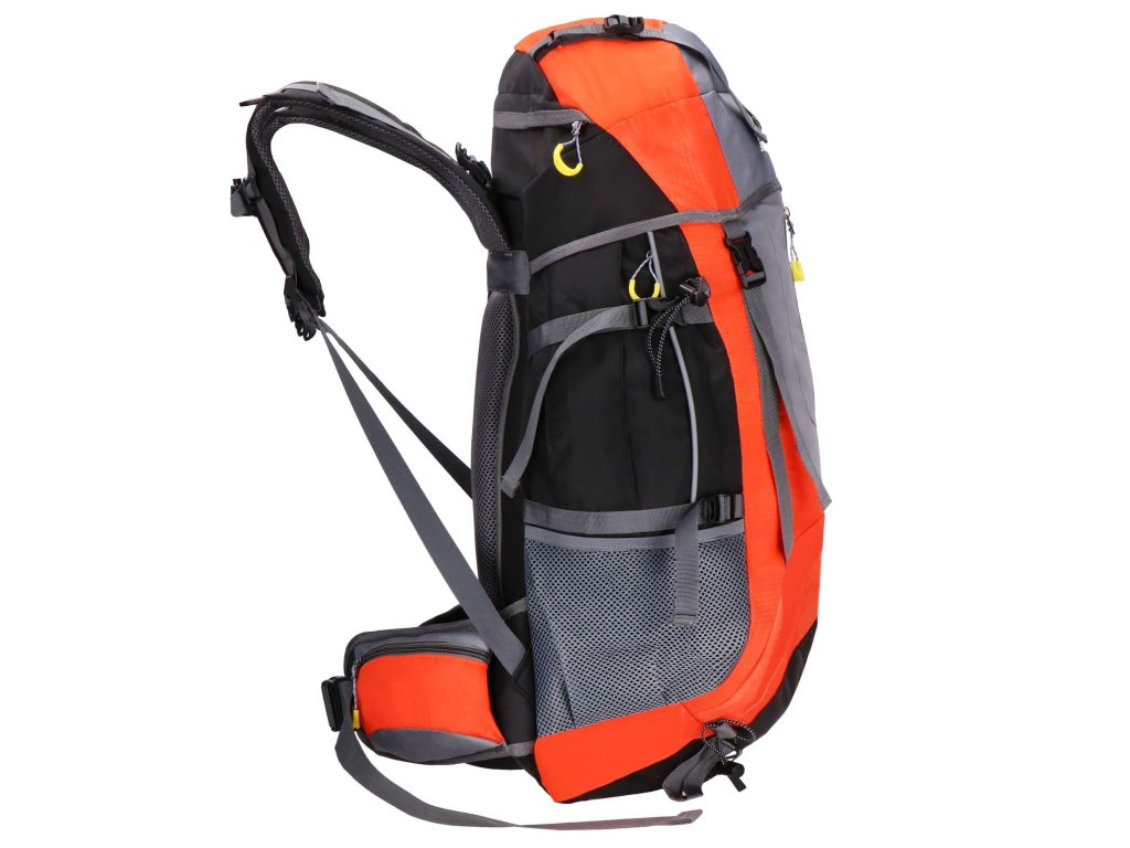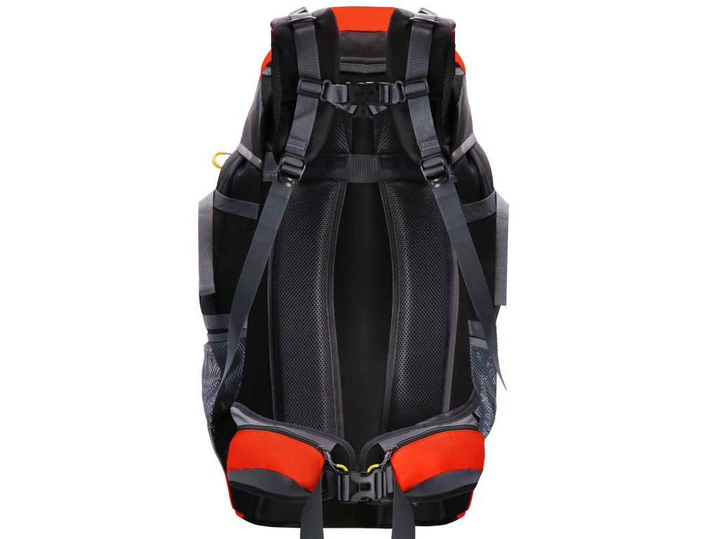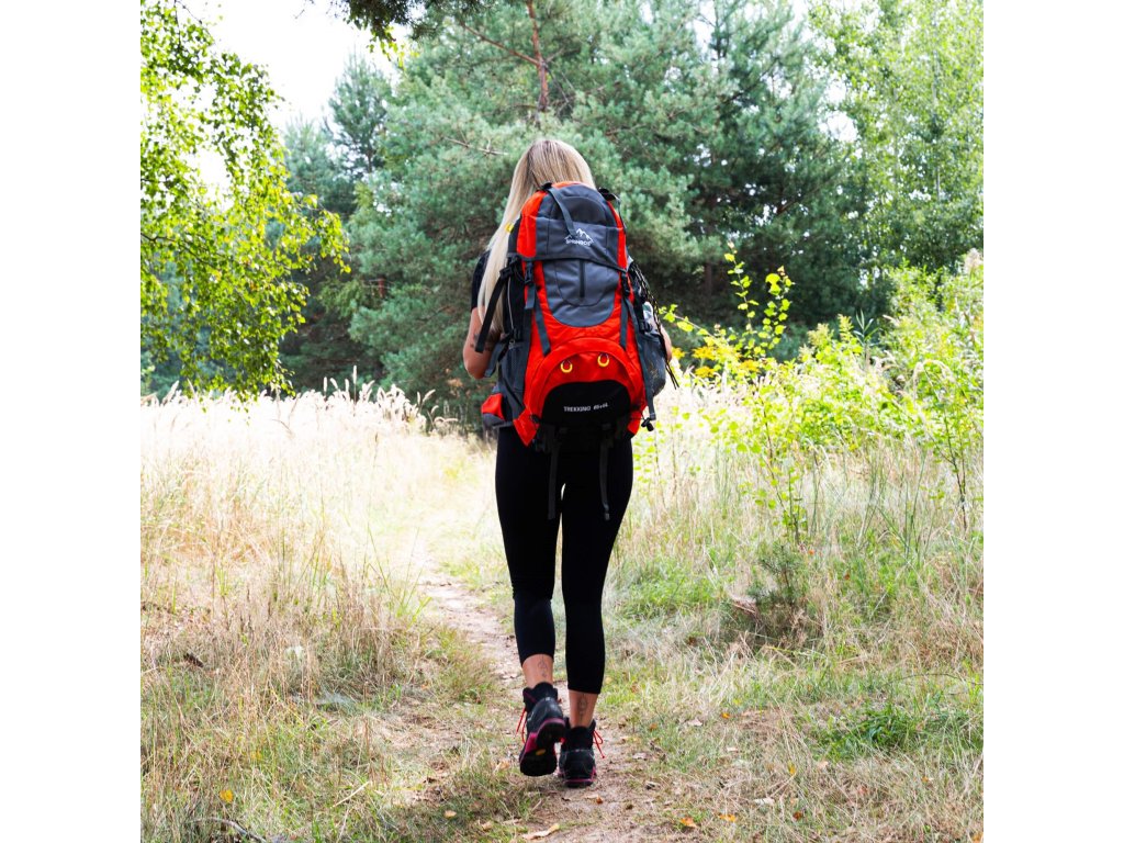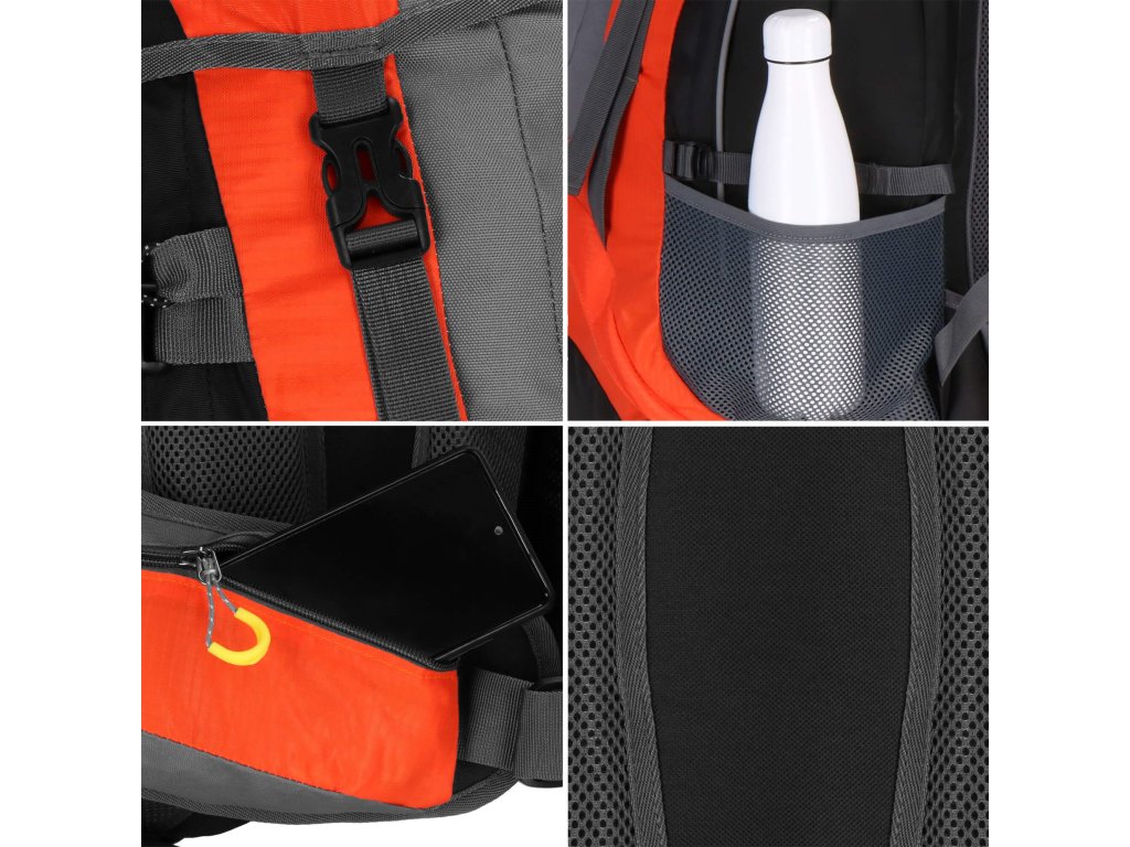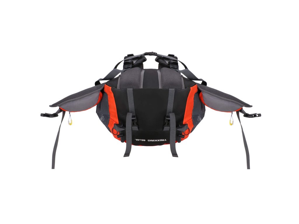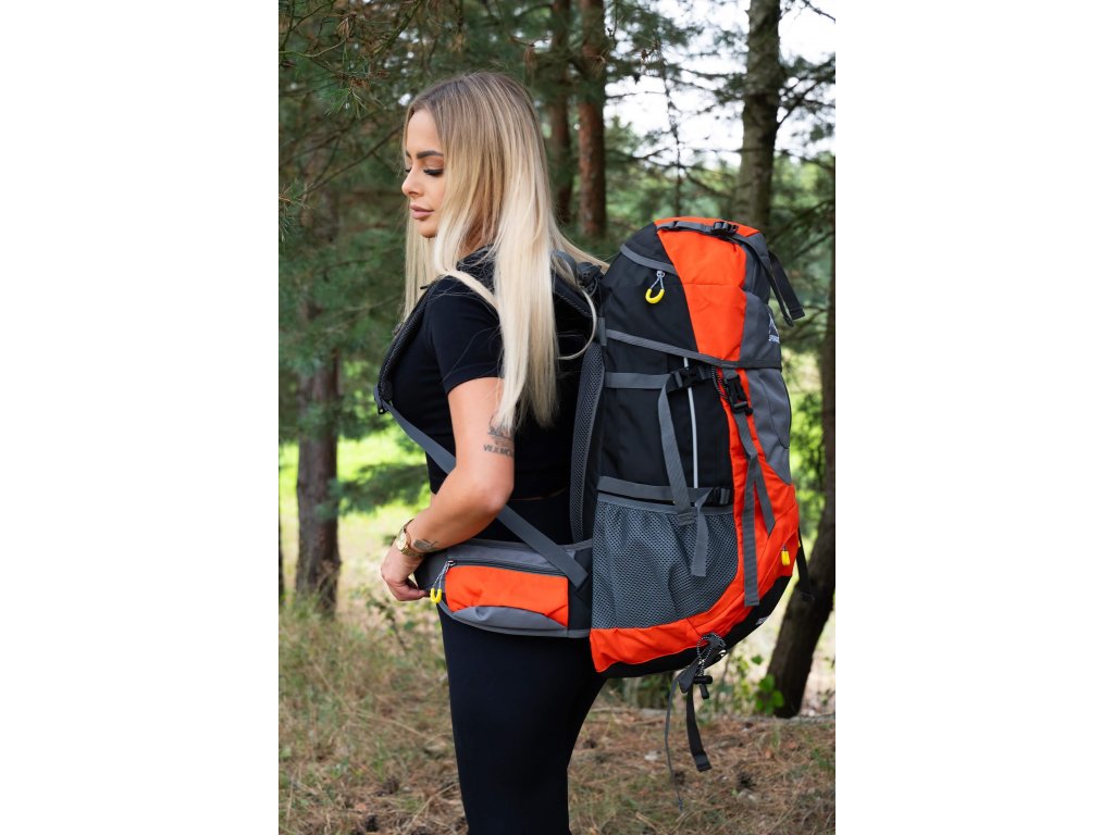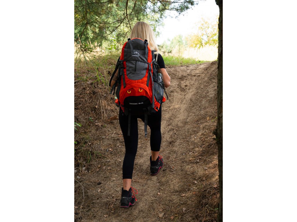 - V hornej časti vpredu klapy vyšívané biele logo Springos, v spodnej časti nápis TREKKING 65+5L.