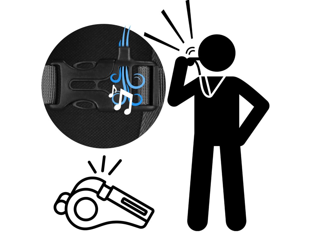 - Možnosť spojenia ramenných popruhov pásom s prackou v prednej časti tela - súčasť pracky obsahuje signalizačnú píšťalku.