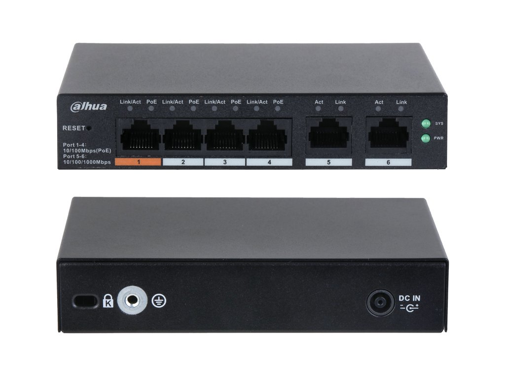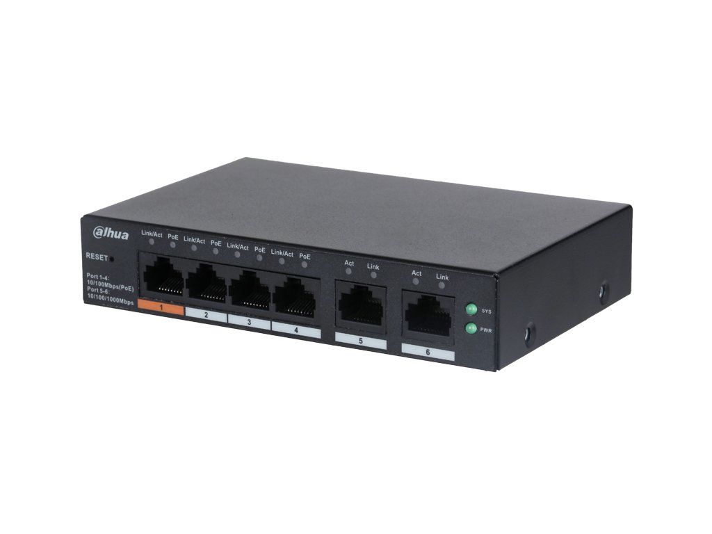 Switch CS4006-4ET-60 značky Dahua je pokročilý sieťový prepínač typu PoE s možnosťou správy v cloude. Zariadenie má 4 porty RJ45 10/100 Mbps s podporou napájania PoE podľa štandardu IEEE802.3af/at, Hi-PoE a 2 porty RJ45 10/100/1000 Mbps typu Uplink. Rozpočet výkonu PoE zariadenia je až 60W pre celý prepínač, pre jednotlivý port je až 30W. Prepínač tiež podporuje štandard Hi-PoE, ktorý umožňuje dodanie 1 portu až 60W výkonu. Prepínač umožňuje správu parametrov prenosu pomocou aplikácie a webového portálu.