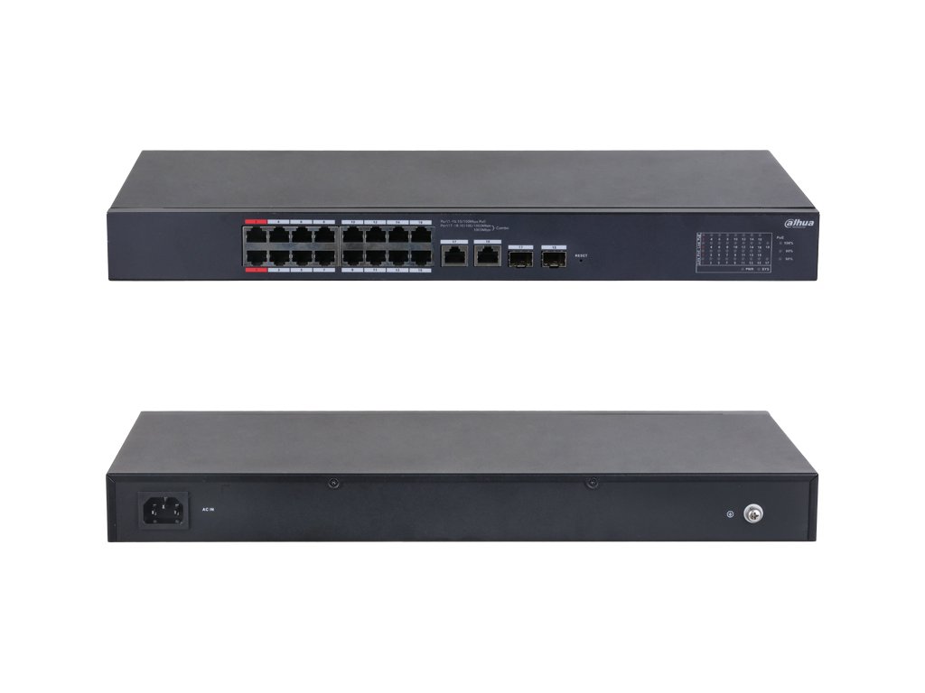 Switch CS4218-16ET-240 značky Dahua je pokročilý sieťový prepínač typu PoE s možnosťou správy v cloude. Zariadenie má 16 portov RJ45 10/100 Mbps s podporou napájania PoE podľa štandardu IEEE802.3af/at/bt, Hi-PoE, 2 porty RJ45 10/100/1000 Mbps typu Uplink a 2 porty SFP 1000Mbps. PoE výkonový rozpočet zariadenia je do 240W pre celý switch, pre jednotlivý port je to do 30W. Switch tiež podporuje štandard Hi-PoE umožňujúci dodanie 2 porty do 90W výkonu (každý). Switch umožňuje správu prenosových parametrov pomocou aplikácie a webového portálu.