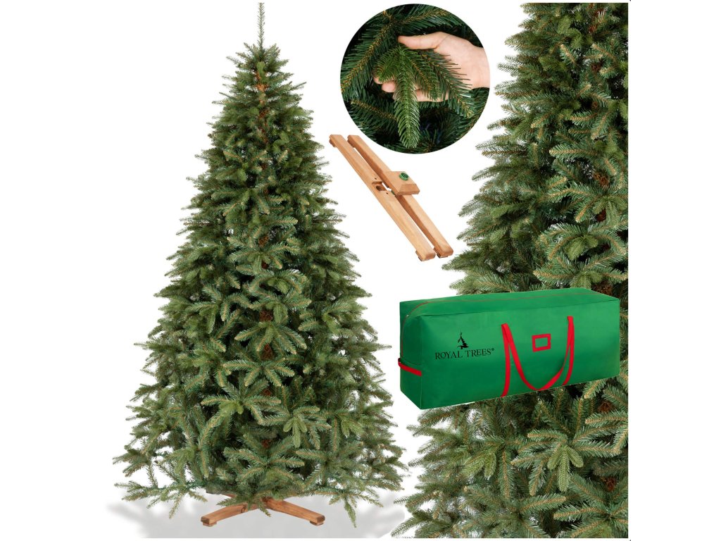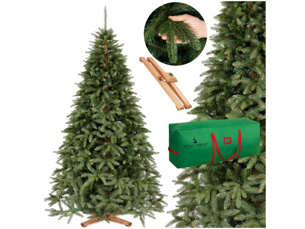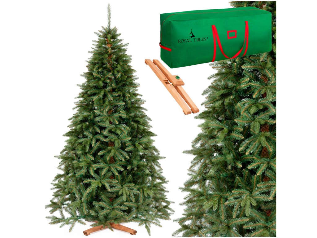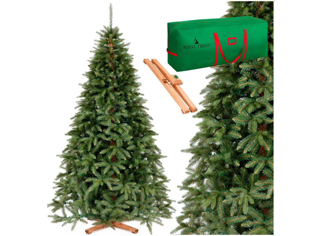 Základné údaje: Značka: Royal Trees® Typ stromčeka: Sibírsky smrek + PE EXCLUSIVE Celková výška (meraná od zeme): 240 cm Materiál ihličia: ekologická PVC, PE farba ihličia: zelená Typ stojana: so štyrmi ramenami Hnedé omotanie imitujúce kmeň stromčeka Koruna: Celková výška (meraná od zeme): 240 cm Maximálny rozsah (meraný v najširšom mieste): približne 142 cm Rozpätie merané vo výške 1 m: približne 92 cm Dĺžka špičky: 27 cm Počet úrovní: 21 + špička Počet vetiev: 116 Počet tipov: 1418 Šírka tipov (jednotlivé vetvičky): približne 3-6 cm Vzdialenosť od zeme po korunu: 24 cm Ukončenie vetiev: špic Počet častí, z ktorých sa skladá koruna: 3 Stojan: Typ: so štyrmi ramenami Materiál: drevo Farba: hnedá Výška (stred stojana): 7,5 cm (+ 3 cm plastová vložka) Výška nohy: 3,5 - 5 cm Dĺžka 1 nohy: 30 cm Šírka 1 nohy: 5 cm Vzdialenosť medzi nohami (meraná na koncoch): 43 cm Rozpätie stojana: 65 cm Obal: Materiál: 100% Polyester Farba: zelená, červená Prišité okienko na kartičku Jednosmerný zips Na obale sa nachádza logo Royal Trees® Rozmery obalu: Výška: 40 cm Dĺžka: 125 cm Šírka: 50 cm Okná: 10 x 7 cm Horná rukoväť: Šírka: 2,5 cm Dĺžka slučky (od povrchu obalu po vrchol slučky): približne 42 cm Celková dĺžka rukoväti: približne 84 cm Bočná rukoväť: Šírka: 2,5 cm Celková dĺžka rukoväti: 20 cm Ďalšie informácie: Rozmery balenia: 120 x 40 x 40 cm Produkt na vlastnú montáž Dvojfarebná fólia: zelená a hnedá imitujúca pravú vetvičku Ultra realistický vzhľad Dôležité: pre dosiahnutie uspokojivého efektu je potrebné vetvy rozložiť a tvarovať s náležitou starostlivosťou. Tolerancia rozmerov je +- 2%. Konštrukcia stromčeku je ťažká/presne prevedená, Vetvičky sú hrubé a masité Videonávod v podobe QR kódu na obaleDodatočné parametre