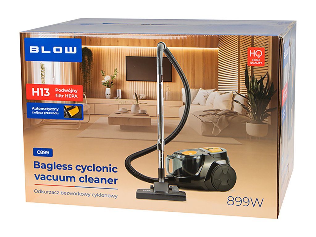 Bezvreckový cyklónový vysávač BLOW C899 je kombináciou modernej technológie a pohodlného používania. Výkon 899 W a sacia sila až do 18 000 Pa zaručujú efektívne čistenie aj tých najnáročnejších povrchov. Dvojitý filter HEPA H13 zachytáva prach, peľ a alergény, zabezpečujúc čistejší vzduch v domácnosti. Vďaka 3-litrovej nádobke na nečistoty, automatickému navíjaču kábla, gumeným kolieskam a teleskopickej tyči sa vysávanie stáva rýchle, pohodlné a bezproblémové.