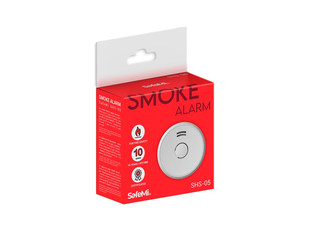 Senzor SafeMi SHS-05 dym detektor je vysoko kvalitné certifikované zariadenie, ktoré vám umožní rýchlo odhaliť akýkoľvek typ dymu a zdroja požiaru. Presný optický senzor umožňuje krátku dobu odozvy. Senzor je napájaný vymeniteľnou 9V batériou, ktorá je súčasťou sady. Senzor je vybavený indikátormi vybitia batérie a ukončenia prevádzky. Tlačidlo Test/Reset a funkcia samokontroly vám umožňujú pravidelne kontrolovať prevádzkový stav snímača. SafeMi SHS-05 je certifikovaný podľa normy EN14604, čo potvrdzuje spoľahlivosť a vysokú kvalitu zariadenia. Na výrobok sa vzťahuje 5-ročná záruka a 10-ročná životnosť. Zariadenie vás bude automaticky informovať o konci životnosti a potrebe výmeny.