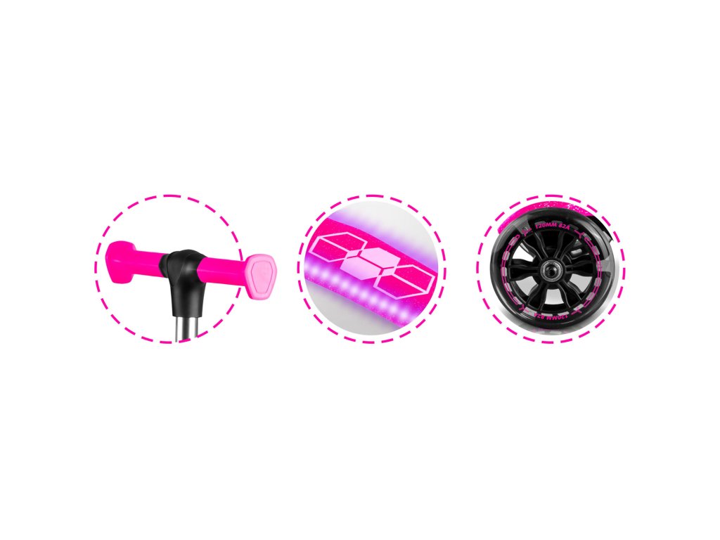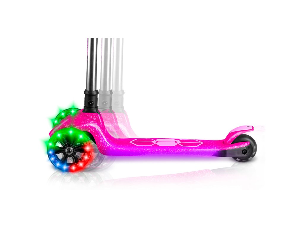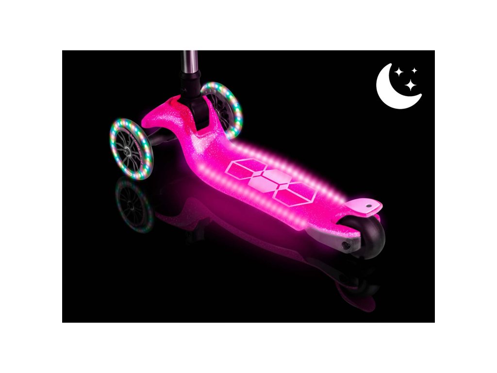Skryté panely LED v plošine kolobežky a svietiace kolieska pridajú trochu mágie k jazde na kolobežke.