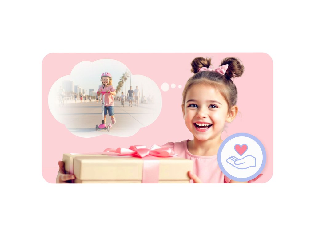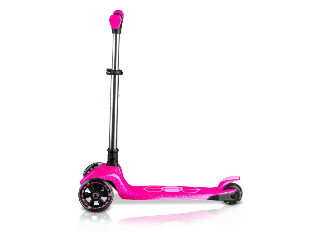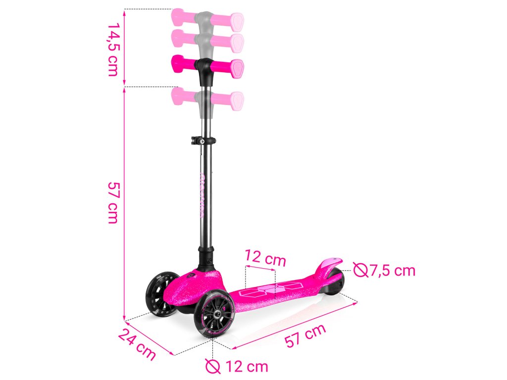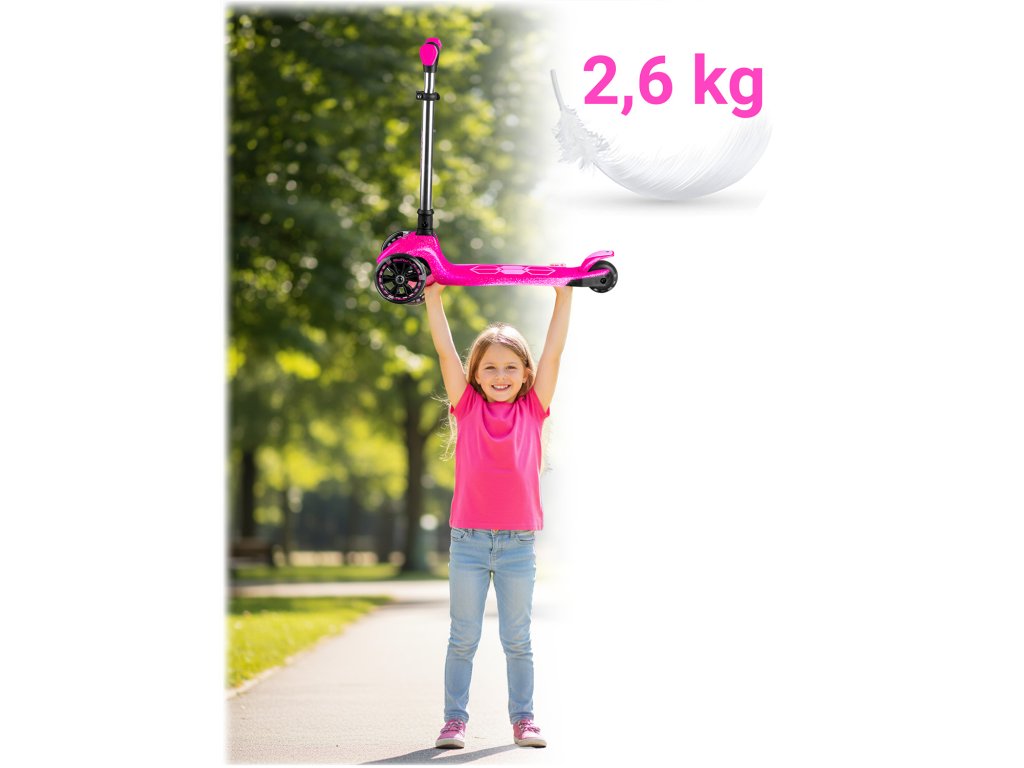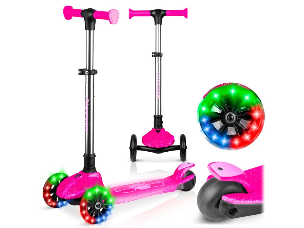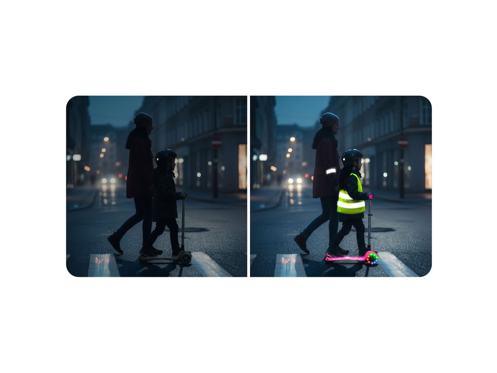 - Výborná zábava! Kolobežka má zabudované dynamo, vďaka čomu kolieska svietia počas jazdy!