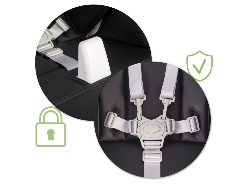 - Dodatočná ochrana , ktorá nedovolí dieťaťu samovoľne vykĺznuť zo stoličky. Dá sa úplne rozobrať, keď už nie je potrebný.