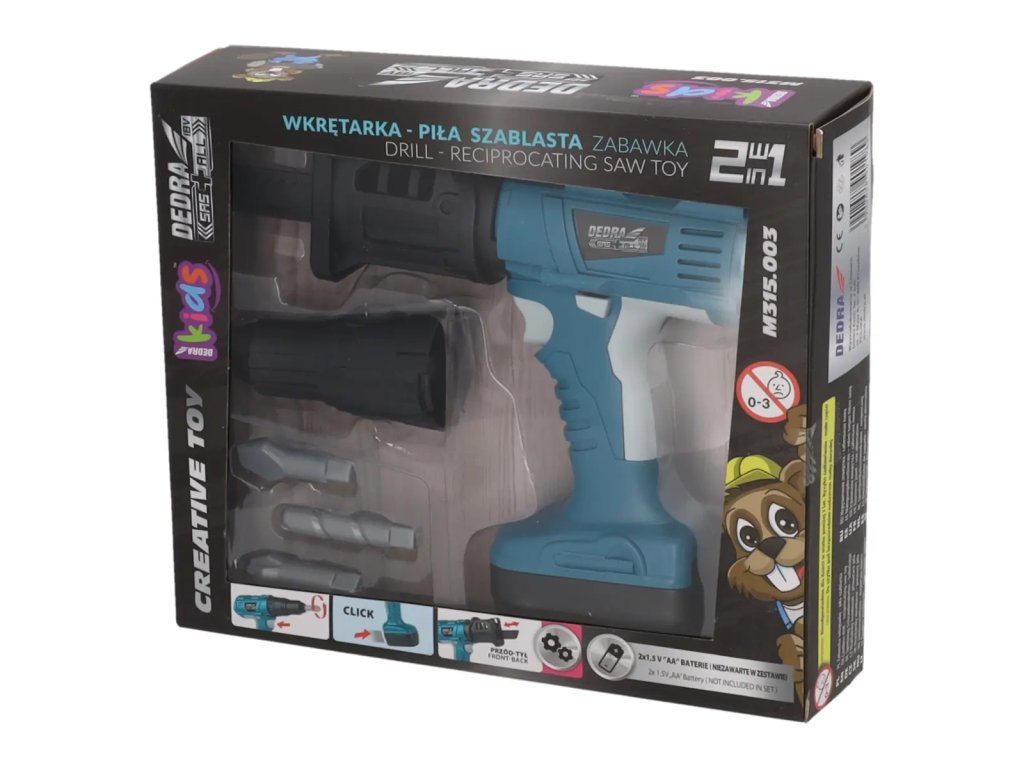 Hračka má vymeniteľnú hlavu, vďaka ktorej sa môžete hrať so skrutkovačom alebo šabľovou pílou - to z nej robí hračku 2 v 1, a keď vaše dieťa omrzí jedno zariadenie, môžete ho rýchlovymeniť za iné. Okrem toho sú v súprave tri vrtáky, aby bolo hranie s náradím realistickejšie a rozmanitejšie.< br />