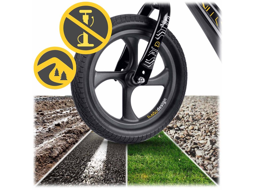 - Koleso: veľké, pevné koleso z peny EVA s odolnou pneumatikou, zabezpečujúce stabilitu a plynulosť jazdy.