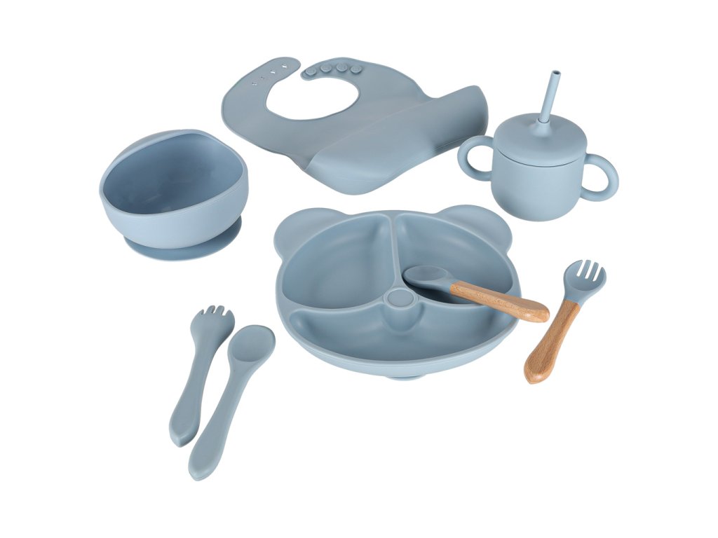 - Veľký počet kusov - miska, tanier, príbor, hrnček a podbradník