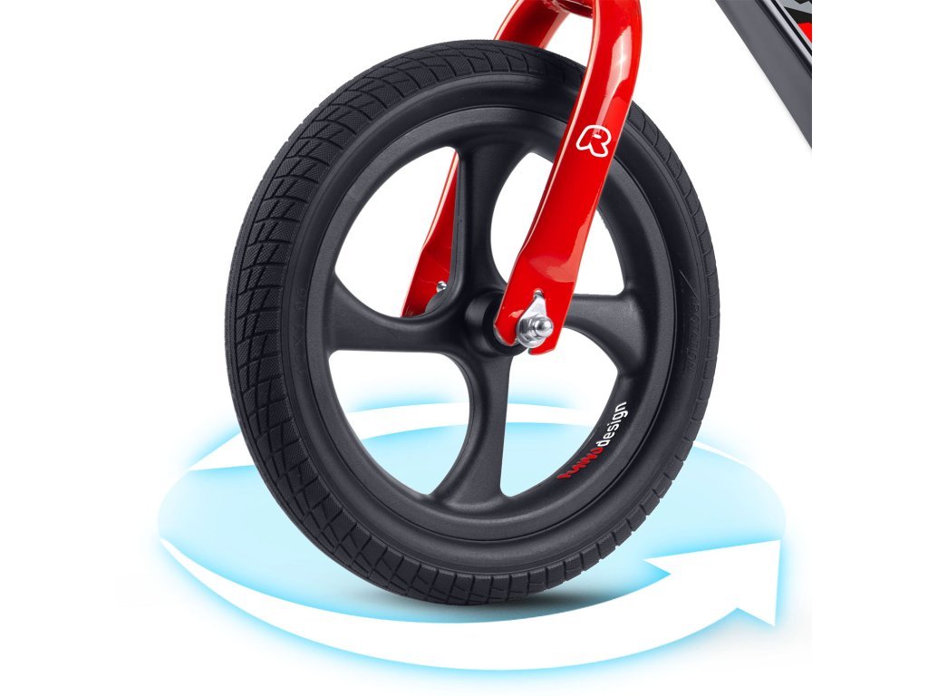 - Koleso: veľké, pevné koleso z peny EVA s odolnou pneumatikou, zabezpečujúcou stabilitu a plynulú jazdu.