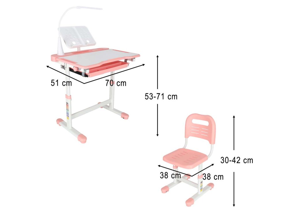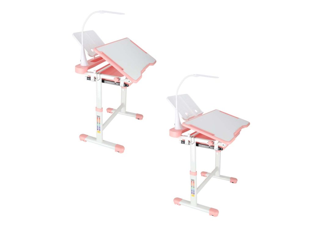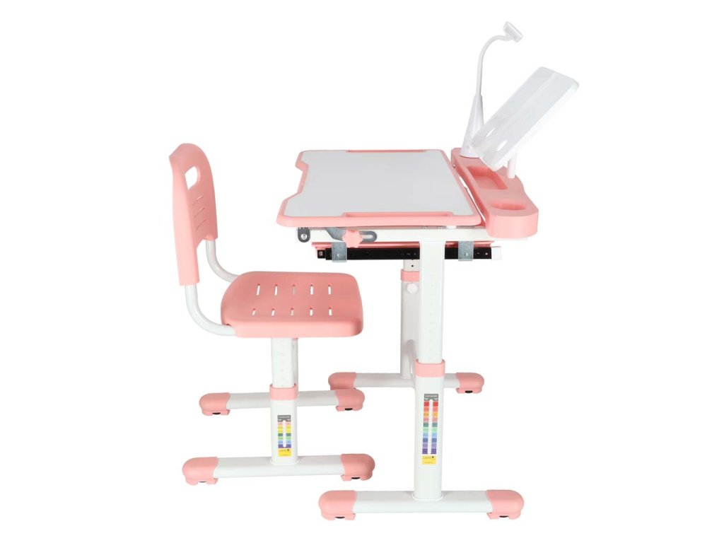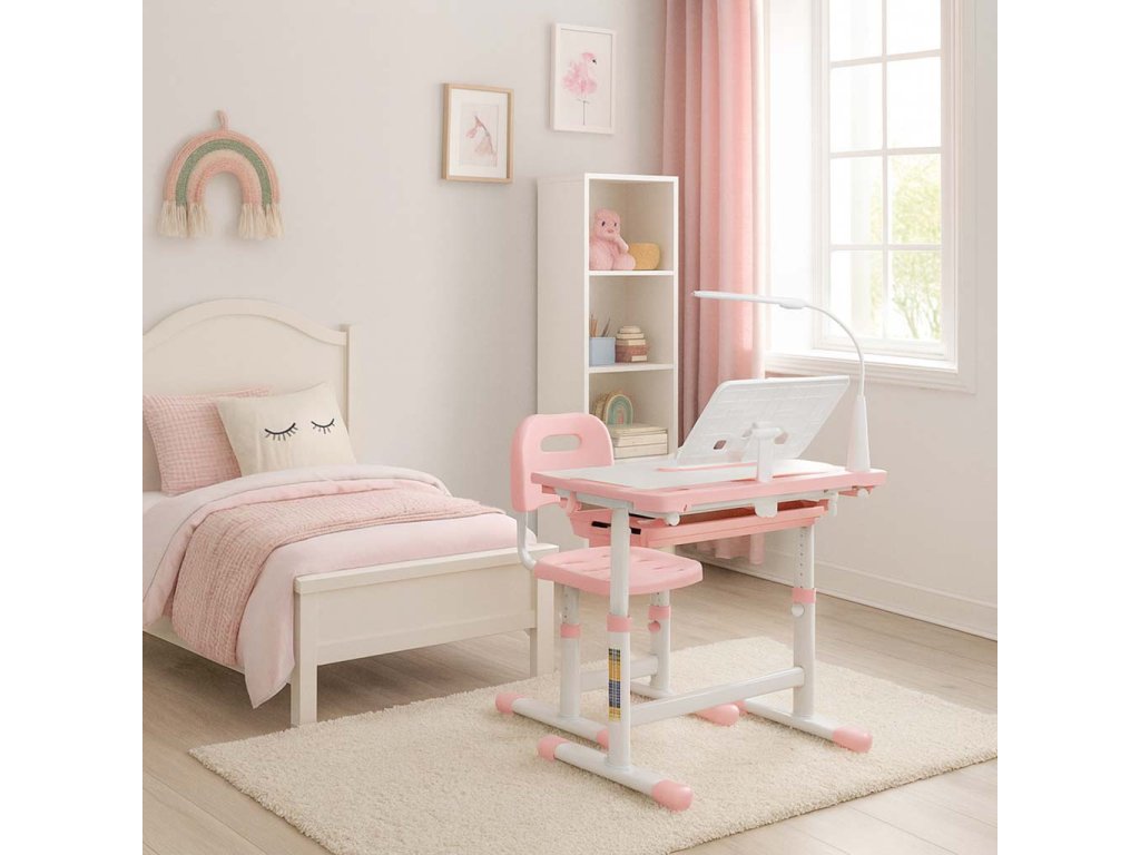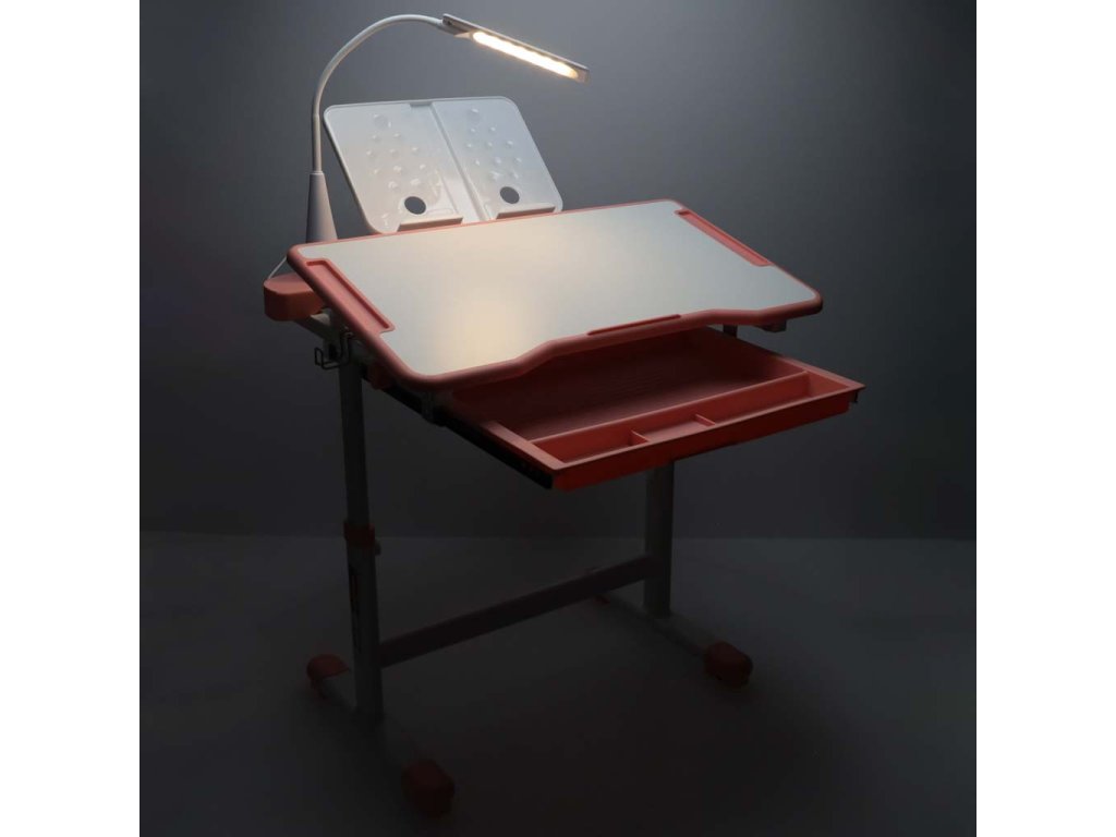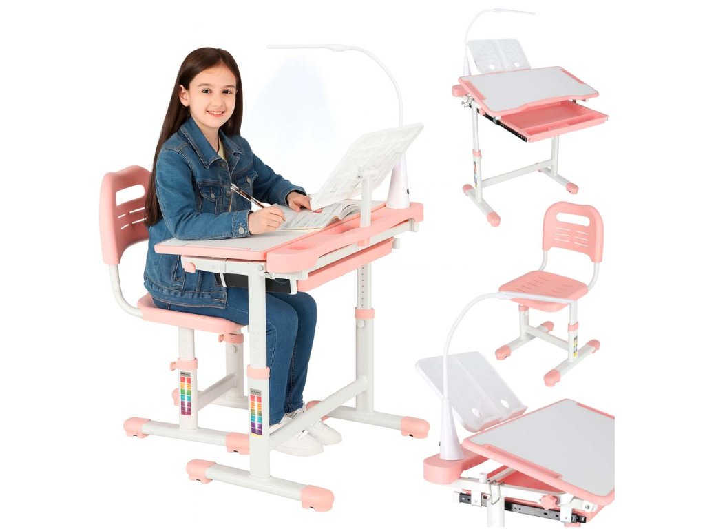 Detský písací stôl so zásuvkou stolička lampa ružová
