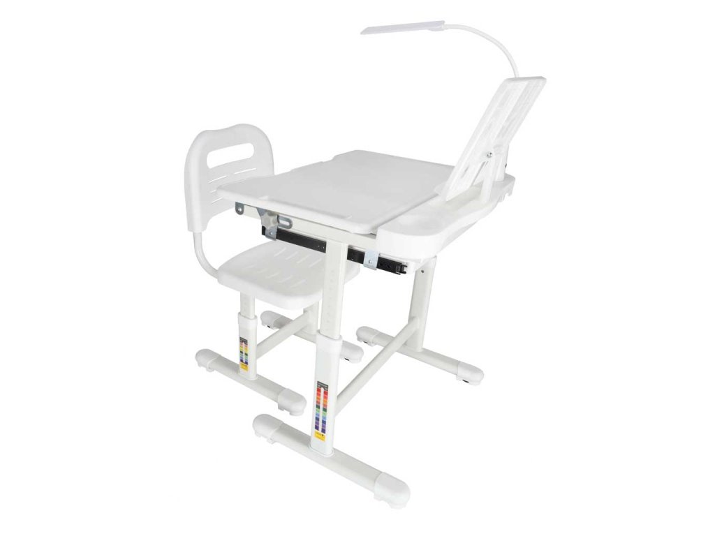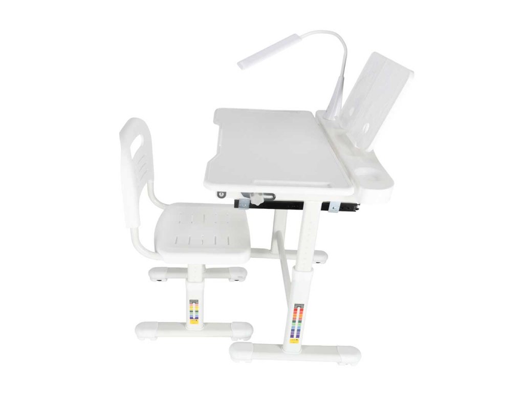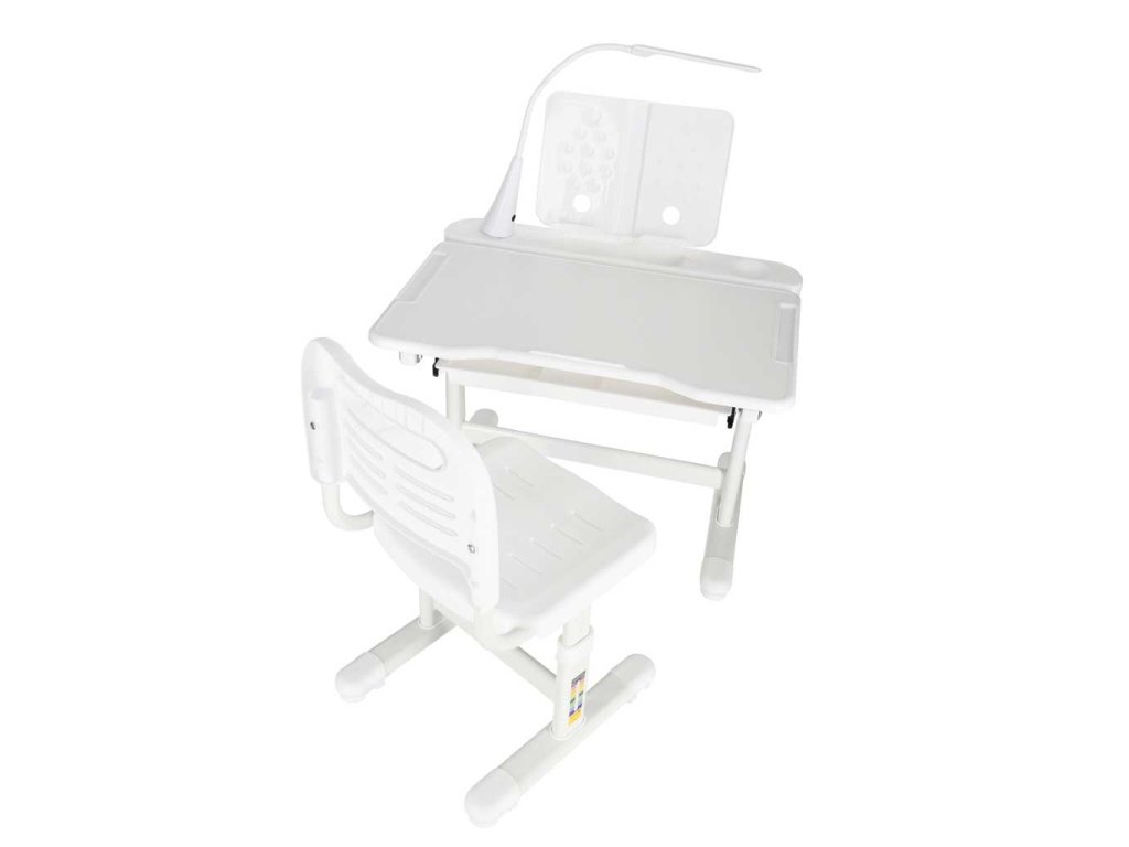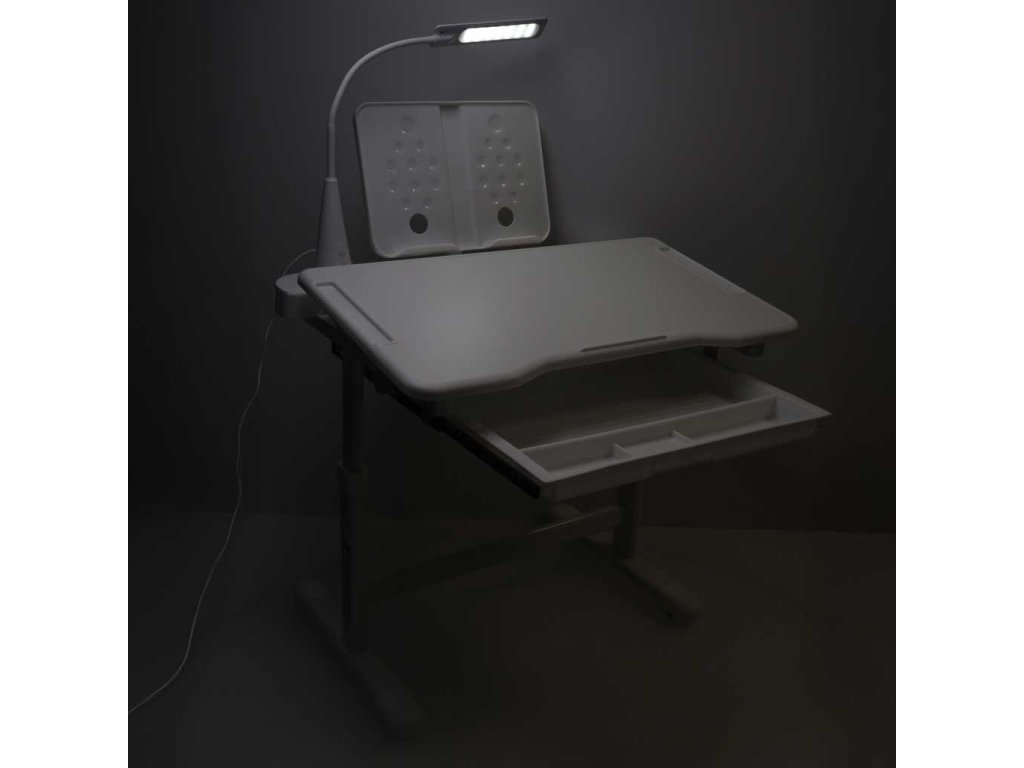 Súprava obsahuje výškovo nastaviteľnú detskú stoličku pre pohodlie a lepšie prispôsobenie výške dieťaťa. Písací stôl mávýsuvnú zásuvku spriehradkami na usporiadanie pomôcok a praktický stojan na knihy. Dopĺňa ho flexibilná lampa, ktorá je ideálna na učenie v ktorúkoľvek dennú dobu. Ide o štýlový písací stôl s moderným dizajnom arobustným rámom, vytvorený na každodenné používanie.