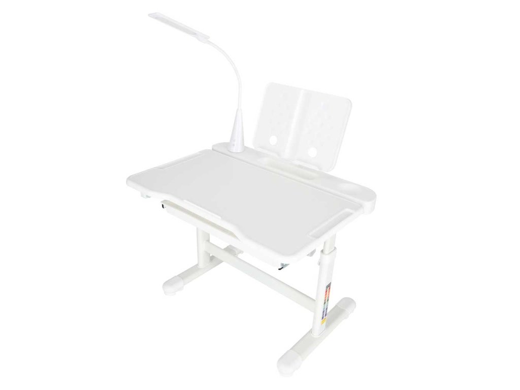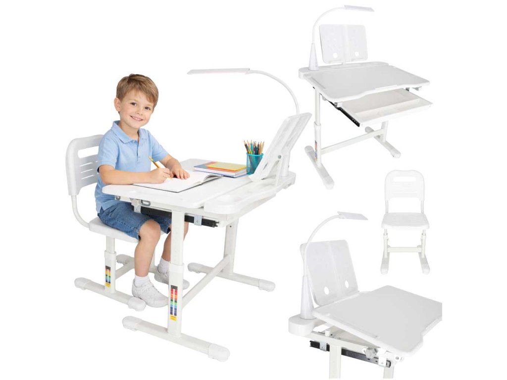 NASTAVITEĽNÝ DETSKÝ STÔL S LED OSVETLENÍM - ERGONOMICKÝ DETSKÝ STÔL BIELY + STOLIČKA A LAMPA