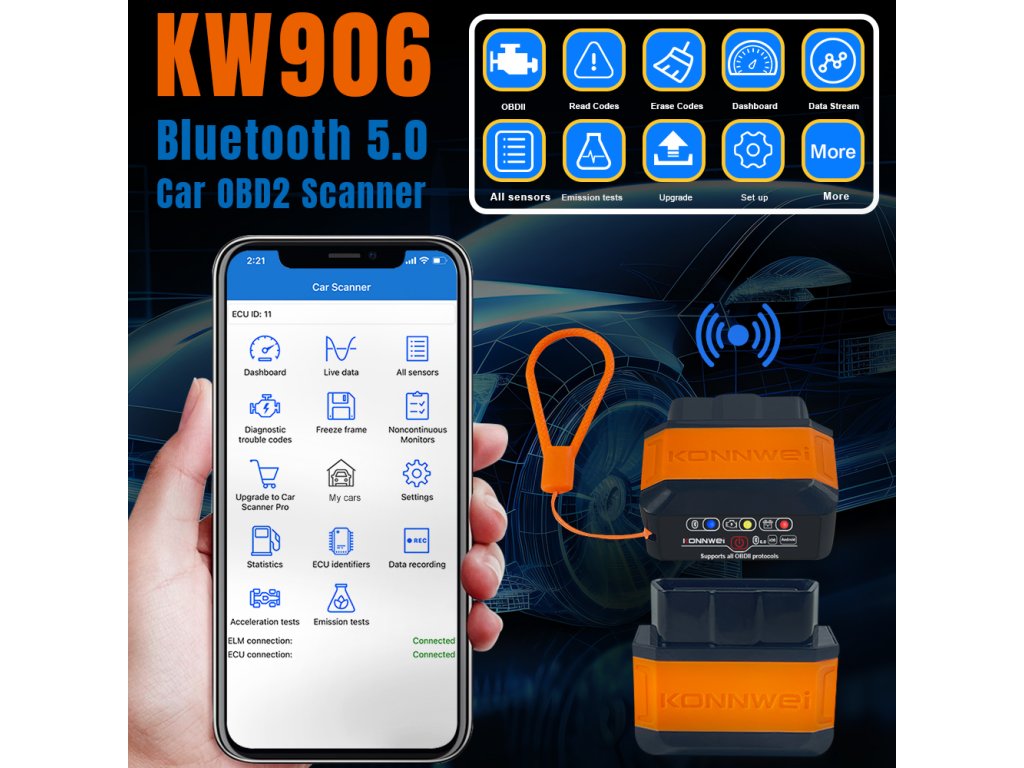 KW906 umožňuje monitorovanie aktuálnych parametrov automobilu, ako sú teplota motora, otáčky, rýchlosť vozidla, napätie batérie a mnohé iné. Vďaka kompaktným rozmerom je jednoduchý na použitie a funkcia testovania senzorov umožňuje overenie ich správneho fungovania. To je zásadné pre diagnostiku systémov riadenia motora, emisií výfukových plynov a iných kľúčových funkcií vozidla.