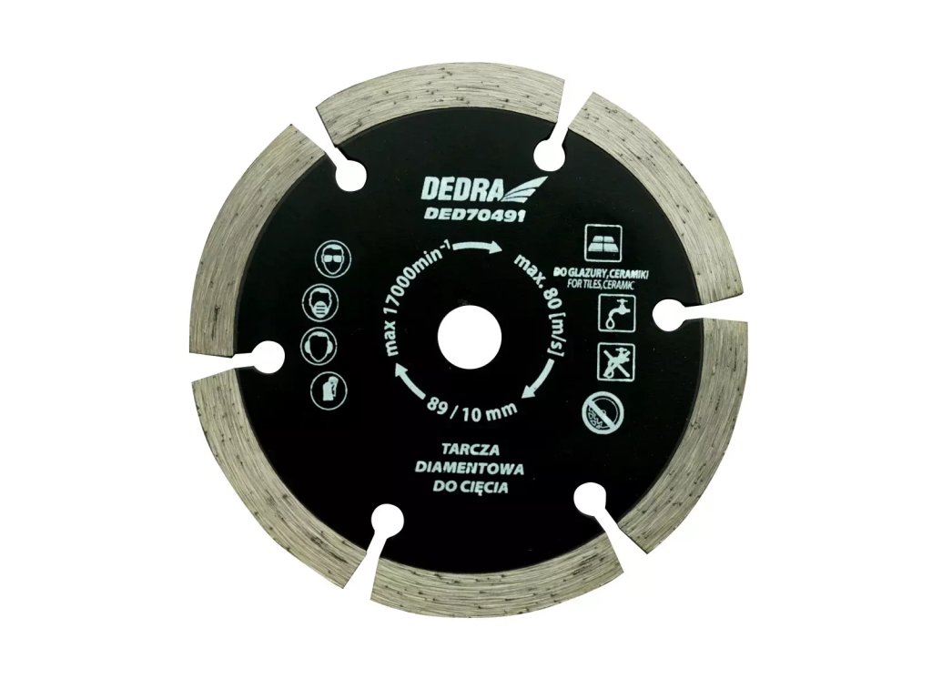 Segmentový diamantový kotúč na rezanie betónu, tehál, slinku, prírodného a umelého kameňa. Vhodné pre stroje napájané z batérie a 230 V siete. Malý priemer kotúča (89 mm) mu umožňuje pracovať pri veľmi vysokých otáčkach (až 17 000 ot./min.), čo vediek vysokej lineárnej rýchlosti pre efektívne rezanie.