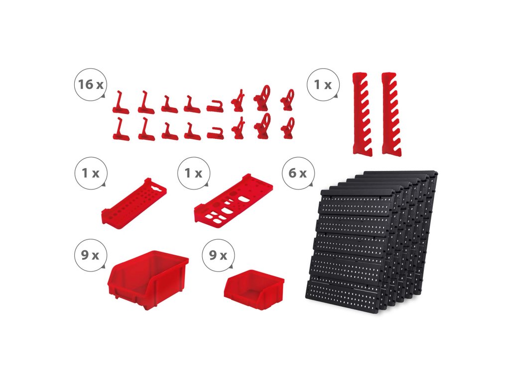 Veľká sada! 6 perforovaných modulárnych panelov a až 43 dodatočných nádobiek, držiakov, políc a háčikov.