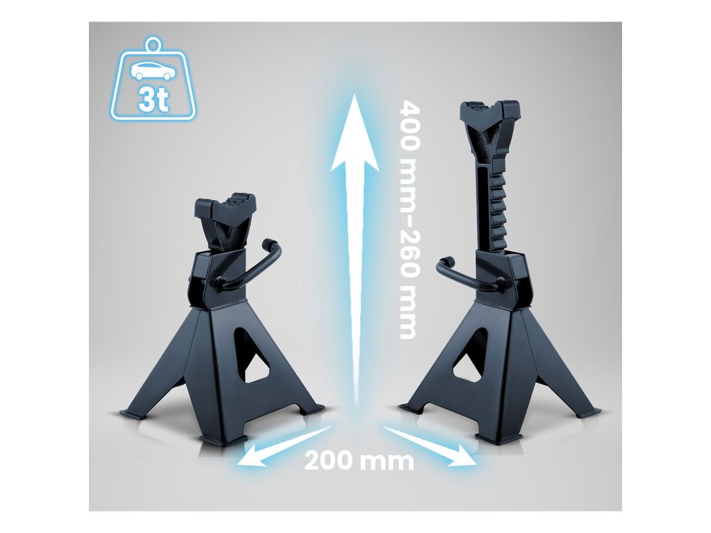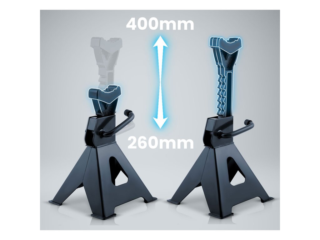 Stojany sú vybavené pohodlným západkovým mechanizmom, ktorý umožňuje rýchle a bezpečné nastavenie výšky v rozsahu od 260 mm do 400 mm. Vďaka tomu ľahko nastavíte vozidlo na správnu úroveň – bez komplikácií a straty času.