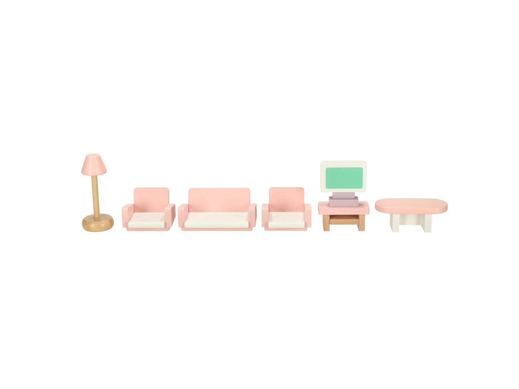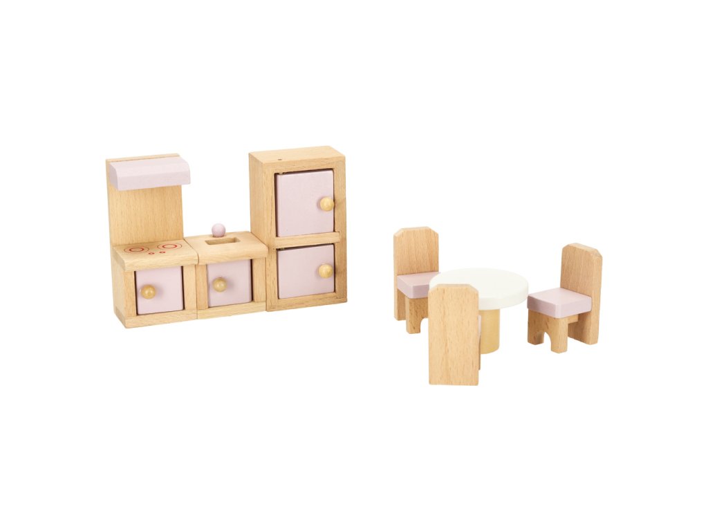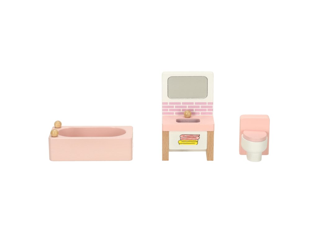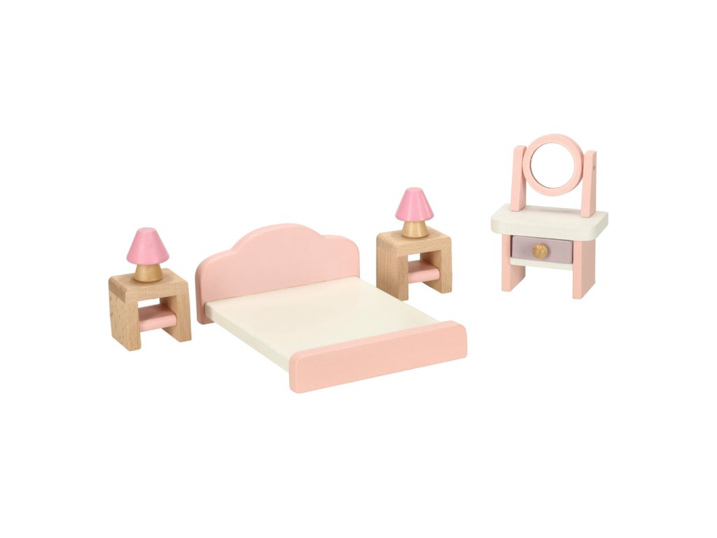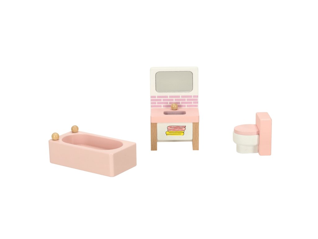 Domček pre bábiky nábytok obývacia izba spálňa kúpeľňa kuchyňa drevený ružový