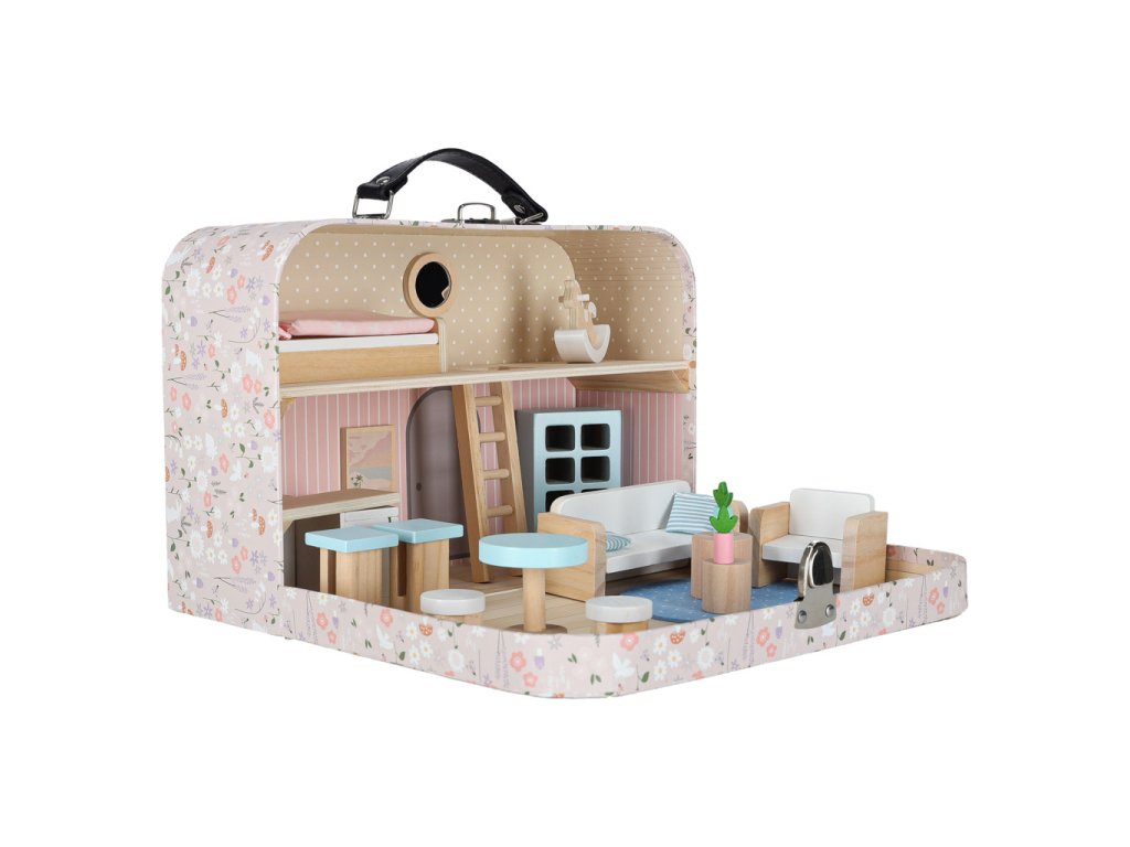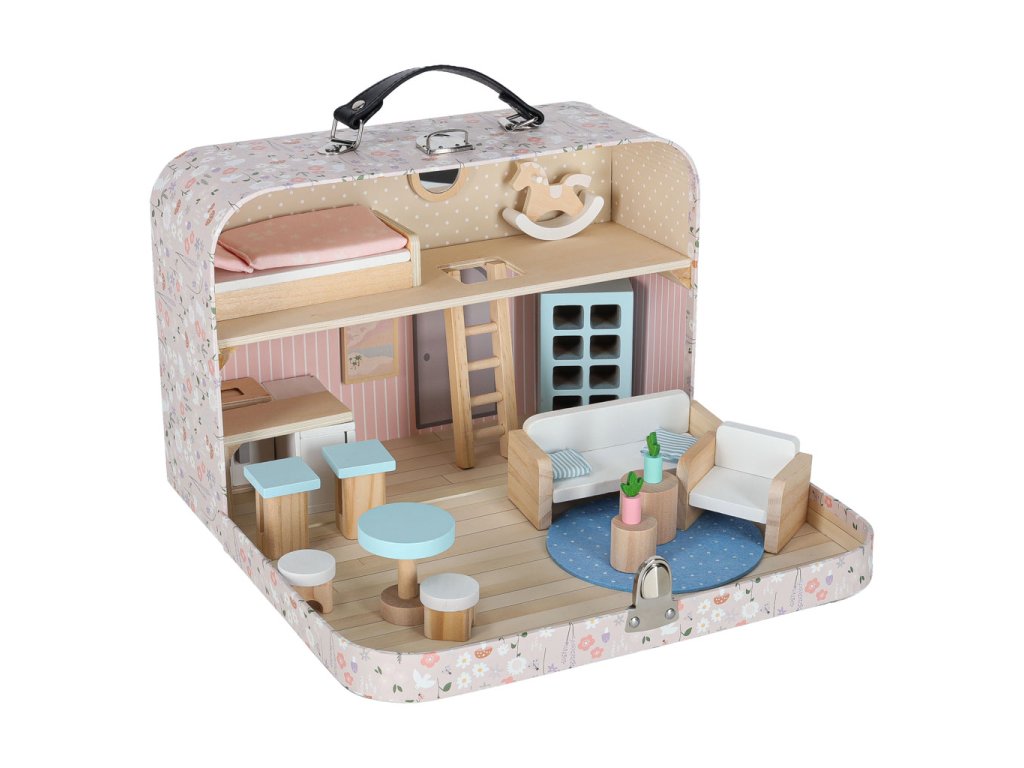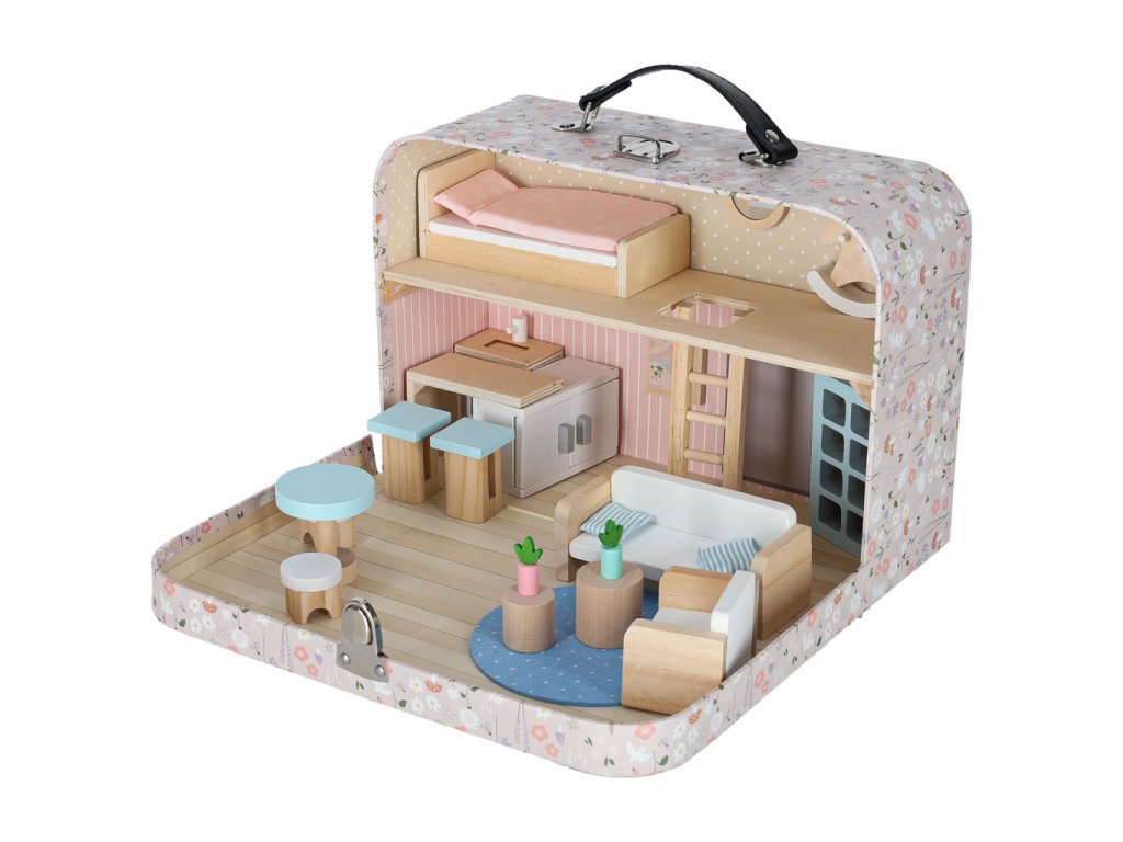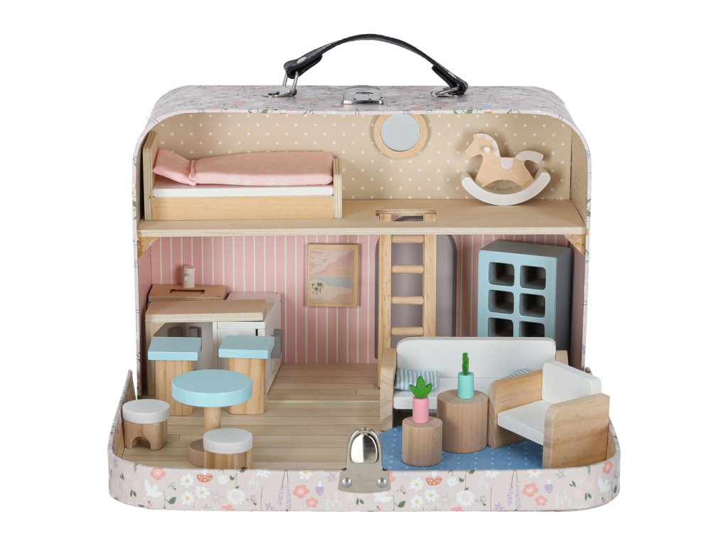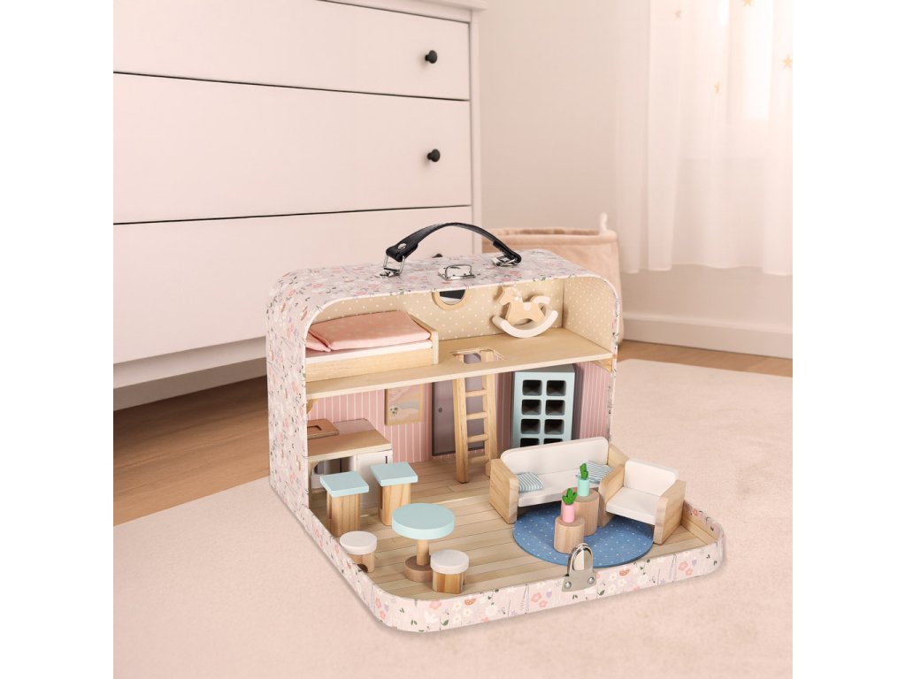 Miniatúrny domček pre bábiky v podobe kufríka ukrýva krásny látkový a drevený nábytok. Jemné pastelové farby v kombinácii s prírodným drevom dodávajú interiéru útulnú atmosféru. Do domčeka pre bábiky možno umiestniť malé bábiky a figúrky - vcítením sa do dobrodružstiev hračiek možno rozvíjať empatiu a emocionálnu inteligenciu.