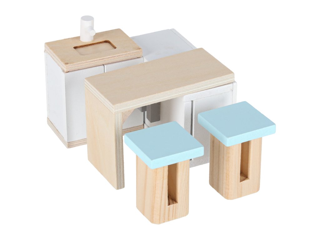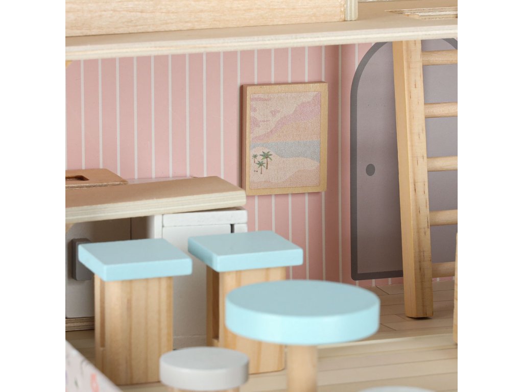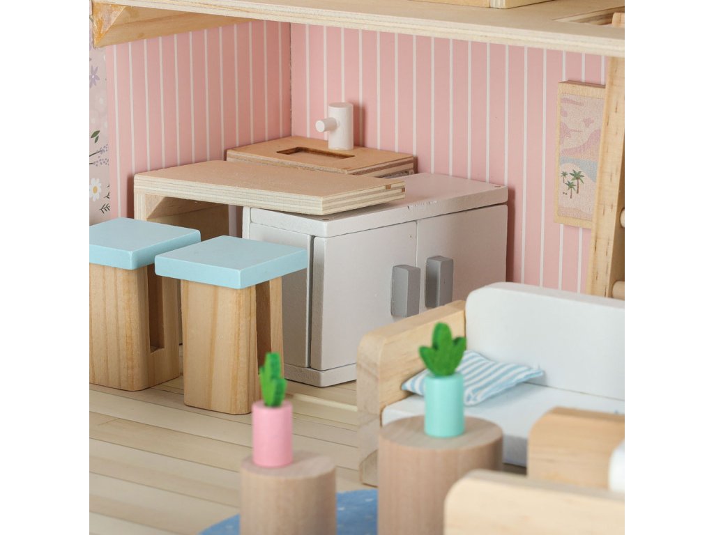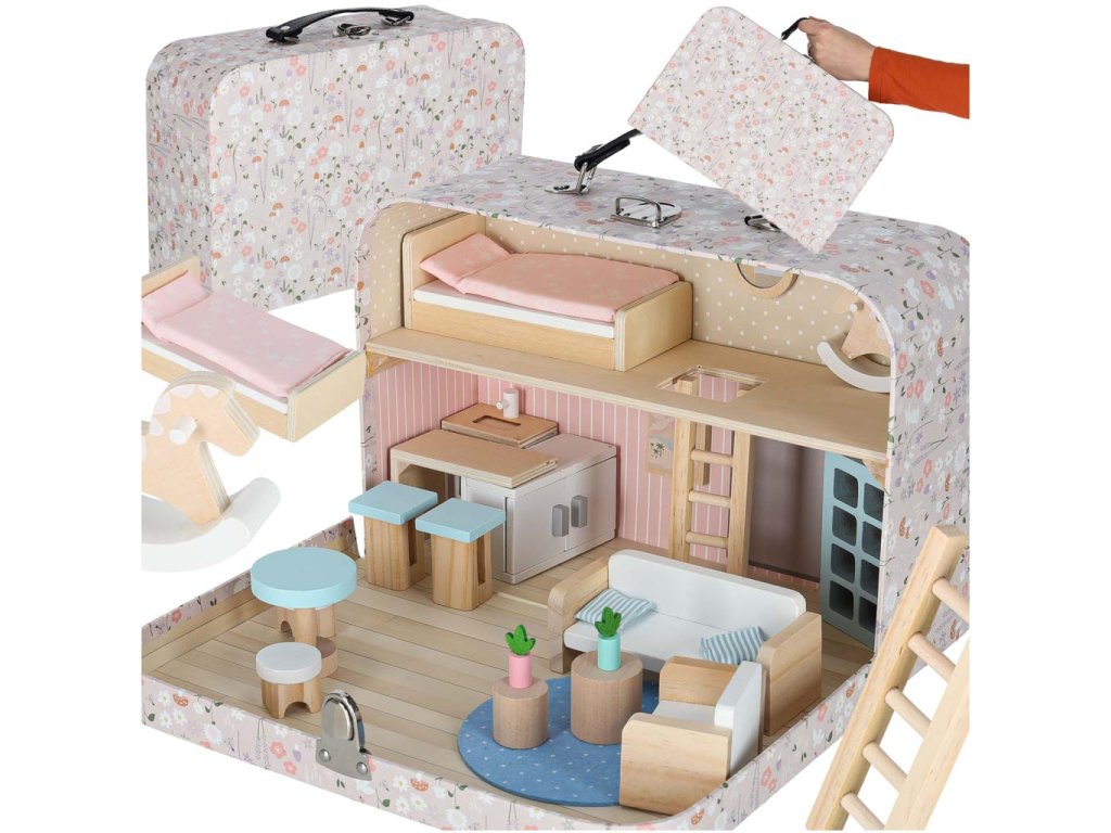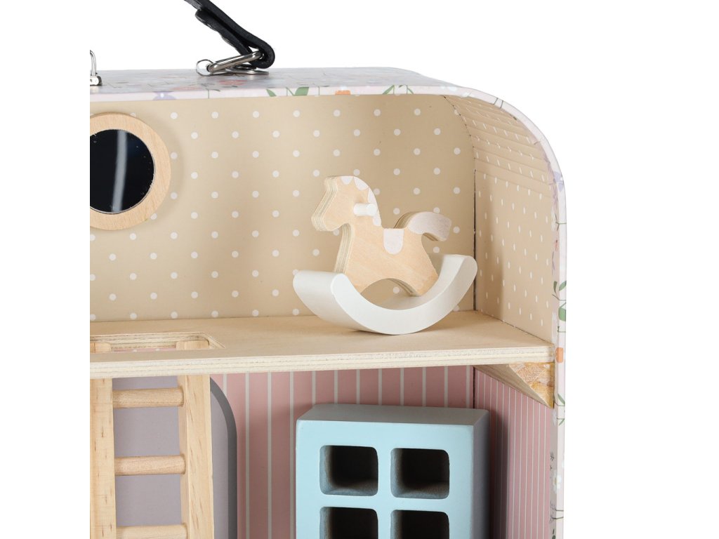 Miniatúrny domček pre bábiky v podobe kufríka ukrýva krásny látkový a drevený nábytok. Jemné pastelové farby v kombinácii s prírodným drevom dodávajú interiéru útulnú atmosféru. Do domčeka pre bábiky možno umiestniť malé bábiky a figúrky - vcítením sa do dobrodružstiev hračiek možno rozvíjať empatiu a emocionálnu inteligenciu.