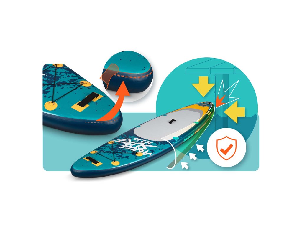 Špeciálne zosilnené hrany chránia dosku pred poškodením a zvyšujú jej trvanlivosť. Vďaka nim je tvoj SUP odolný voči nárazom a intenzívnemu používaniu – pripravený na každé vodné dobrodružstvo.