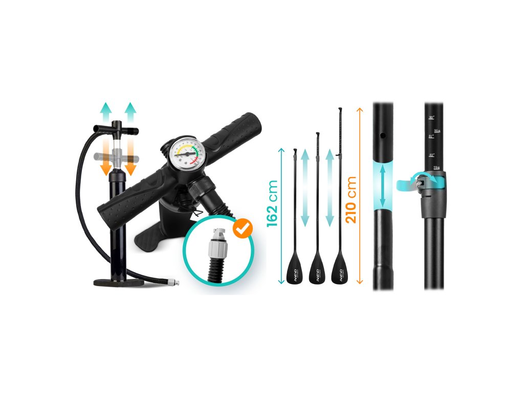 Kompletný set — súčasťou balenia je pádlo, pumpa, surferské vodítko (leash) a batoh.