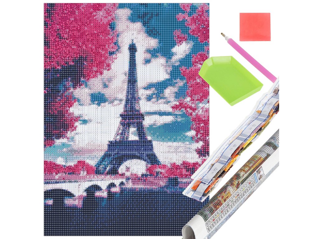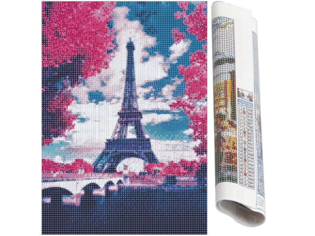 - 1x silné plátno s vytlačeným obrazom zobrazujúcim Eiffelove veže a indexom priraďujúcim písmená k farbám a farby k číslam určujúcim farbu diamantu