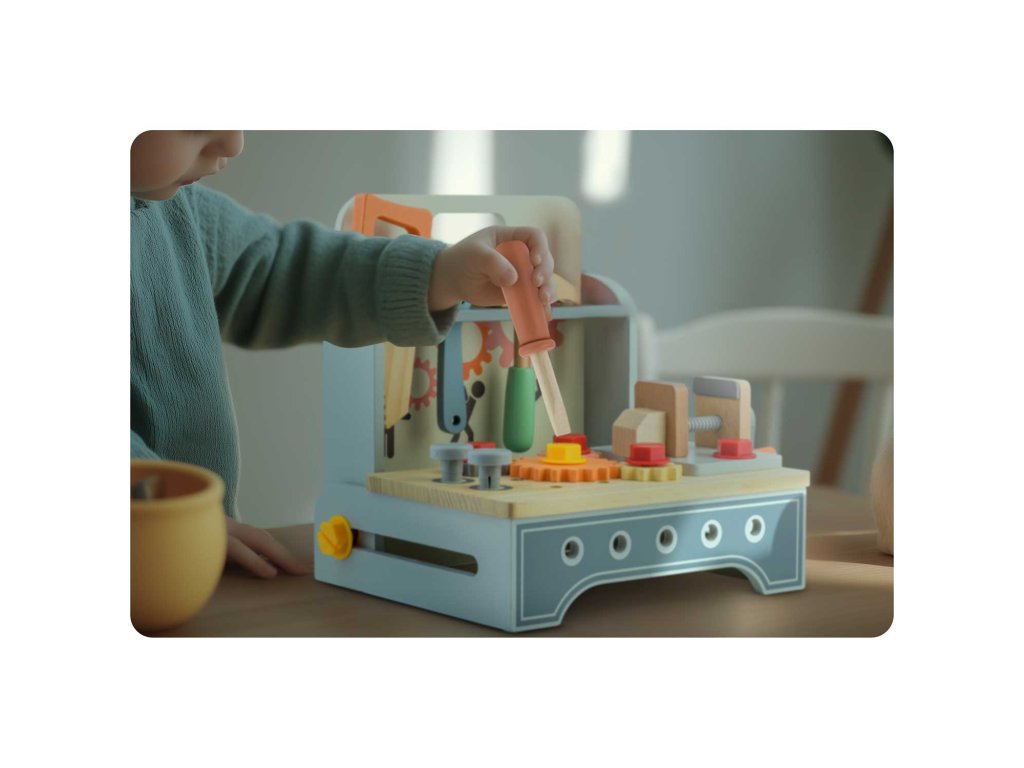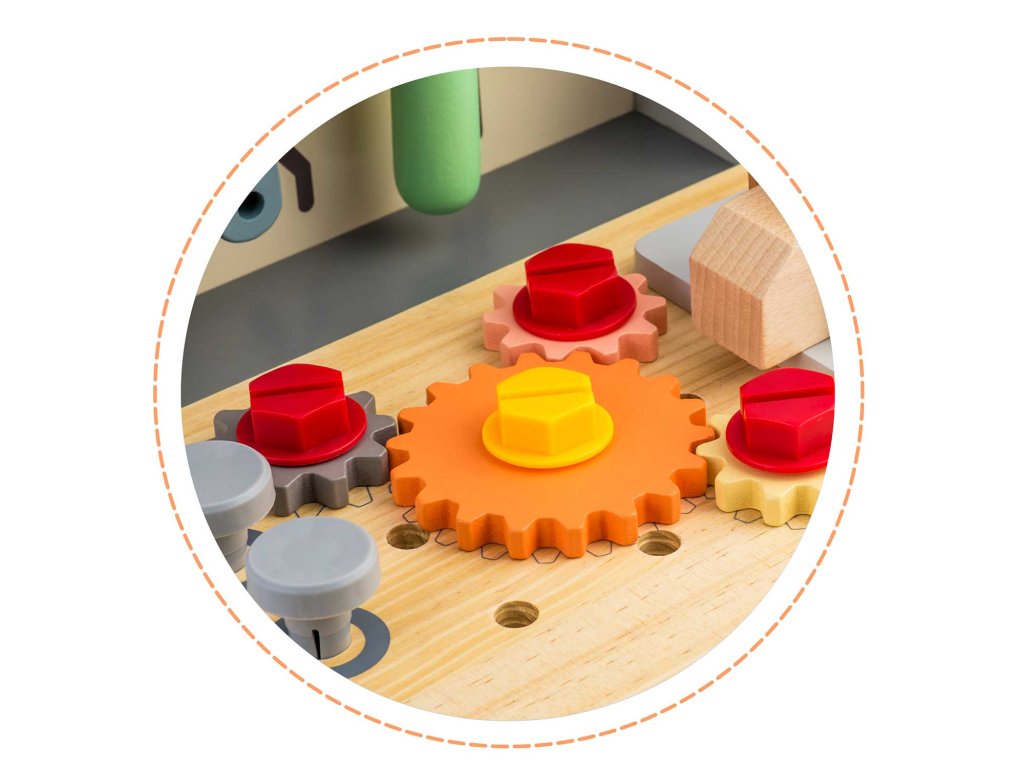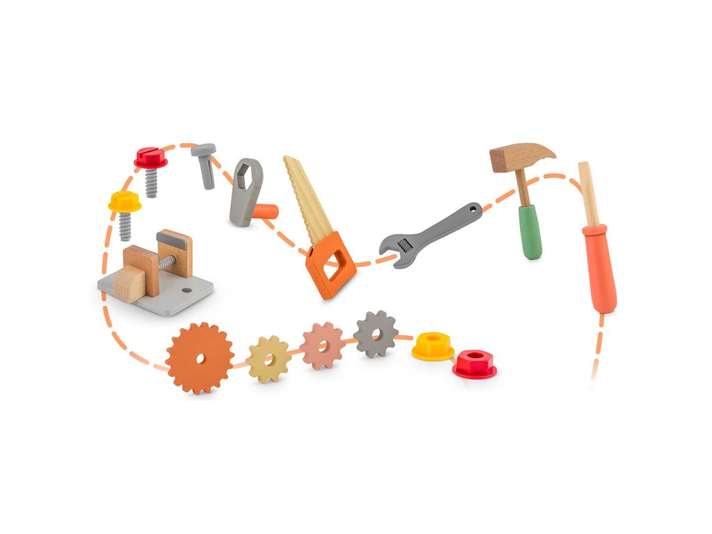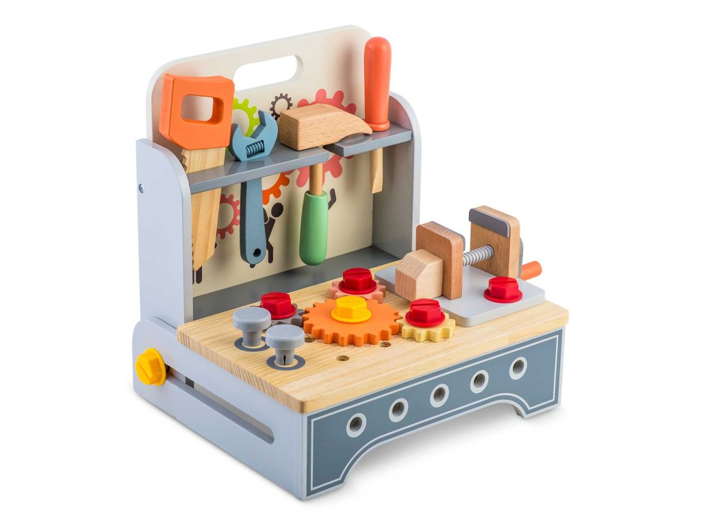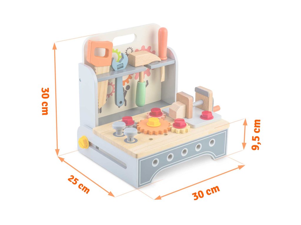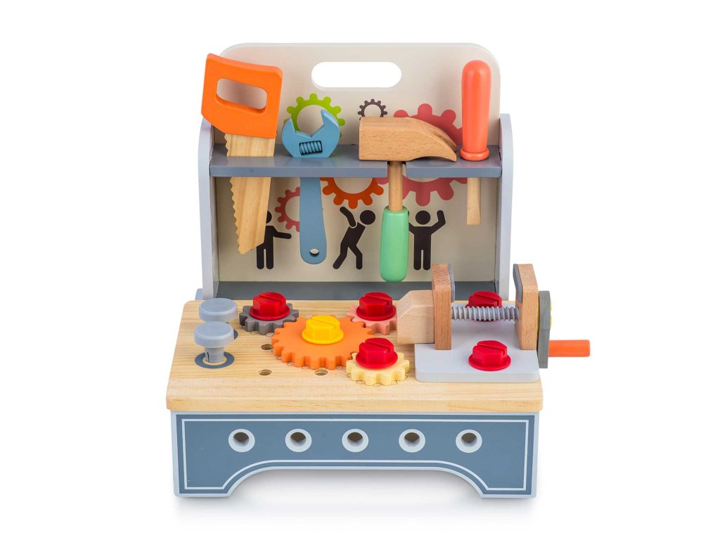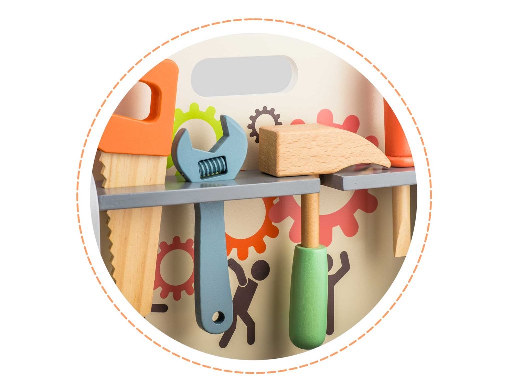 Predstavujeme dielenský stôl pre deti, vybavený poličkami a súpravou nástrojov pripomínajúcich tie skutočné, len vyrobených z plastu ľahkého na údržbu.