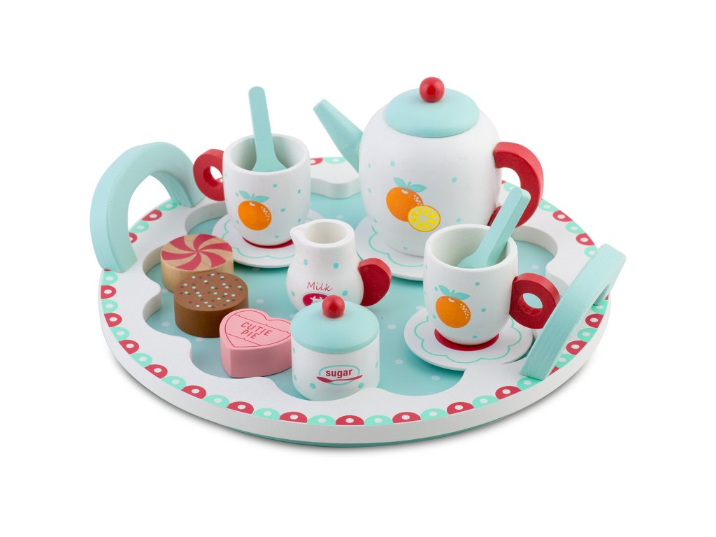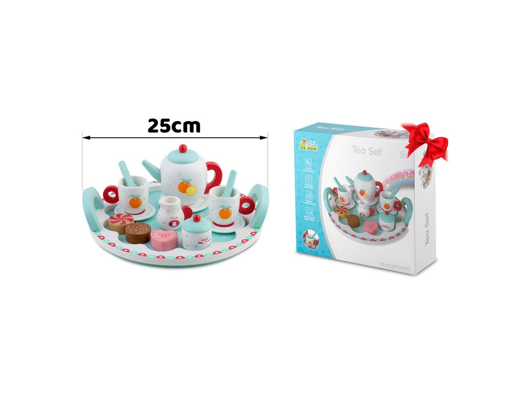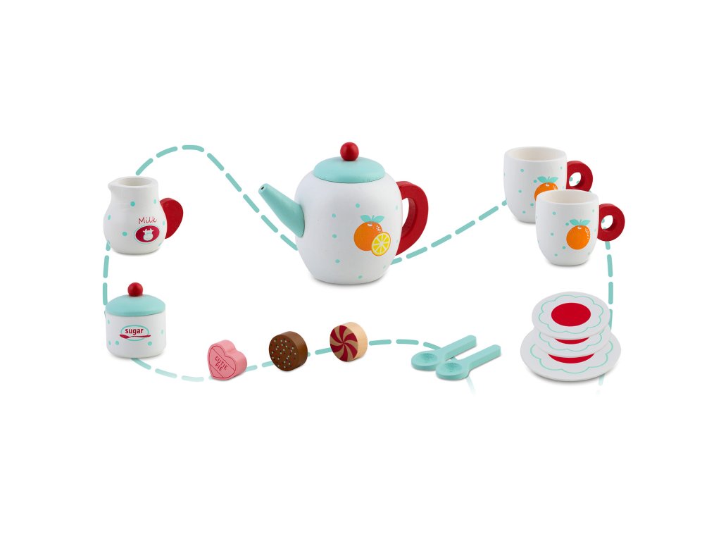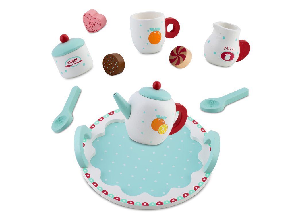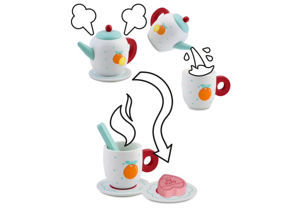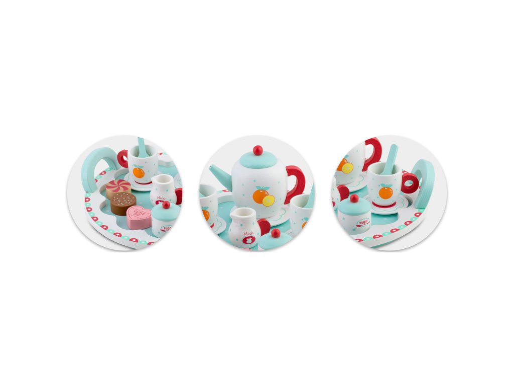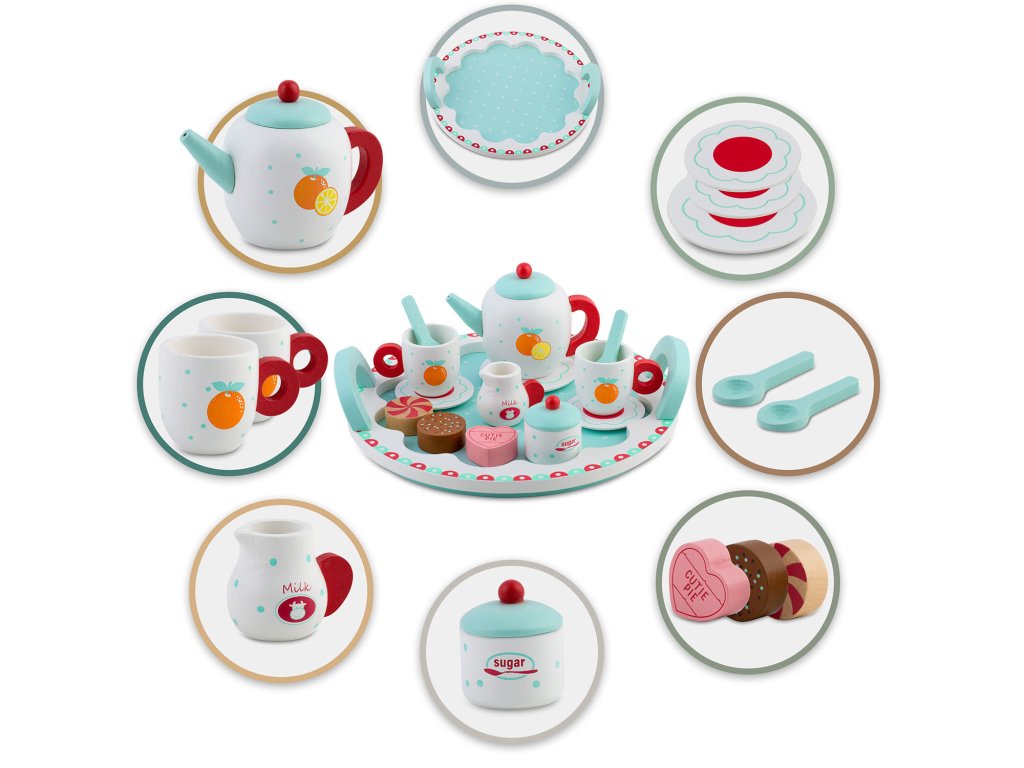 V sade sú vysoko kvalitné drevené prvky, ako sú kanvica, šálky, lyžičky, alebo podnos na servírovanie. Na ňom možno tiež podávať čokoládky, čo dodáva celej scéne autentickosť a umožňuje dieťaťu usporadúvať elegantné večierky.