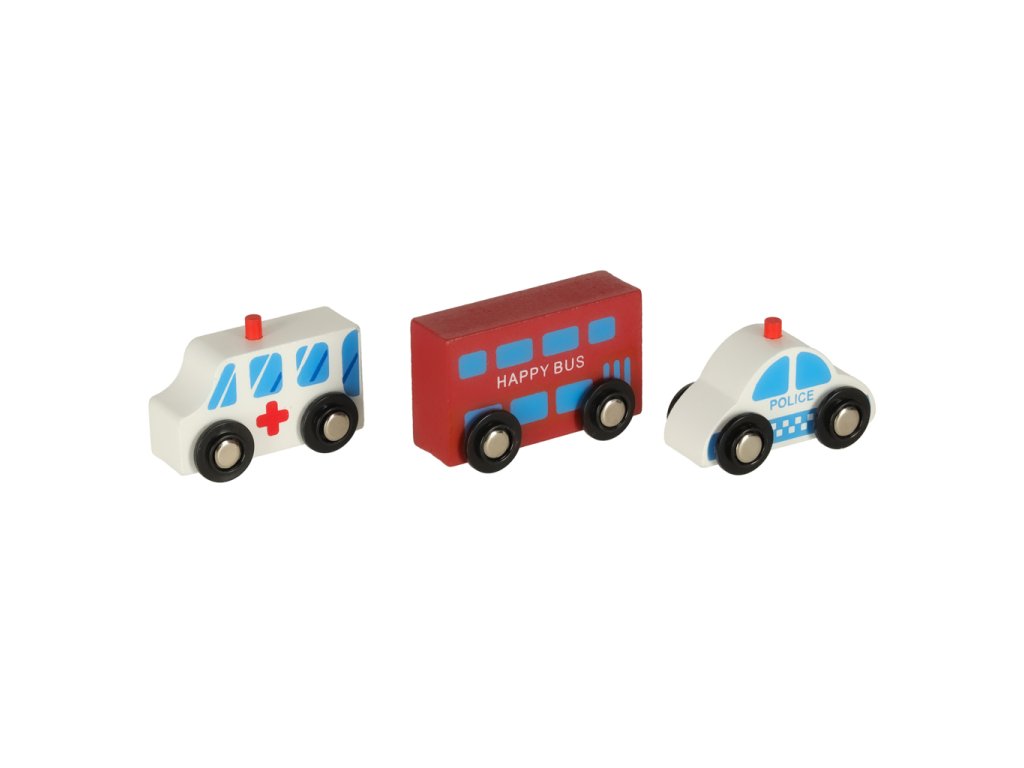 Vozidlá (sanitka, policajné auto, autobus, vlak s 2 vagónmi)
