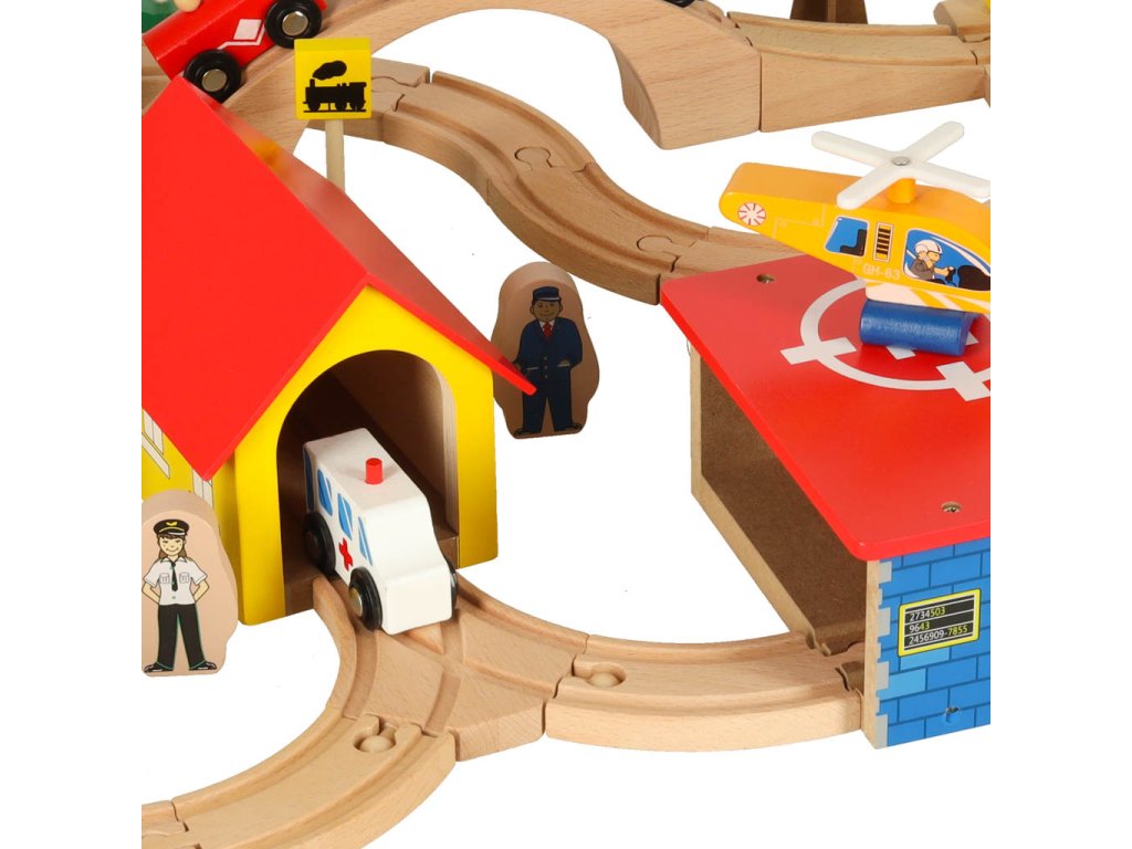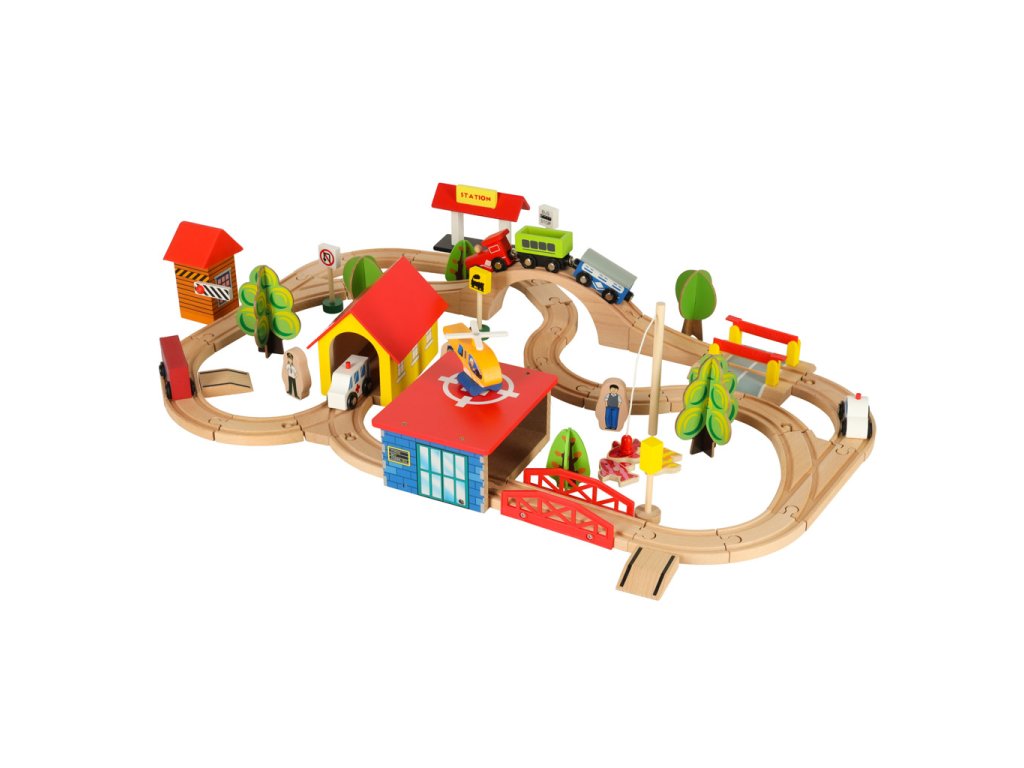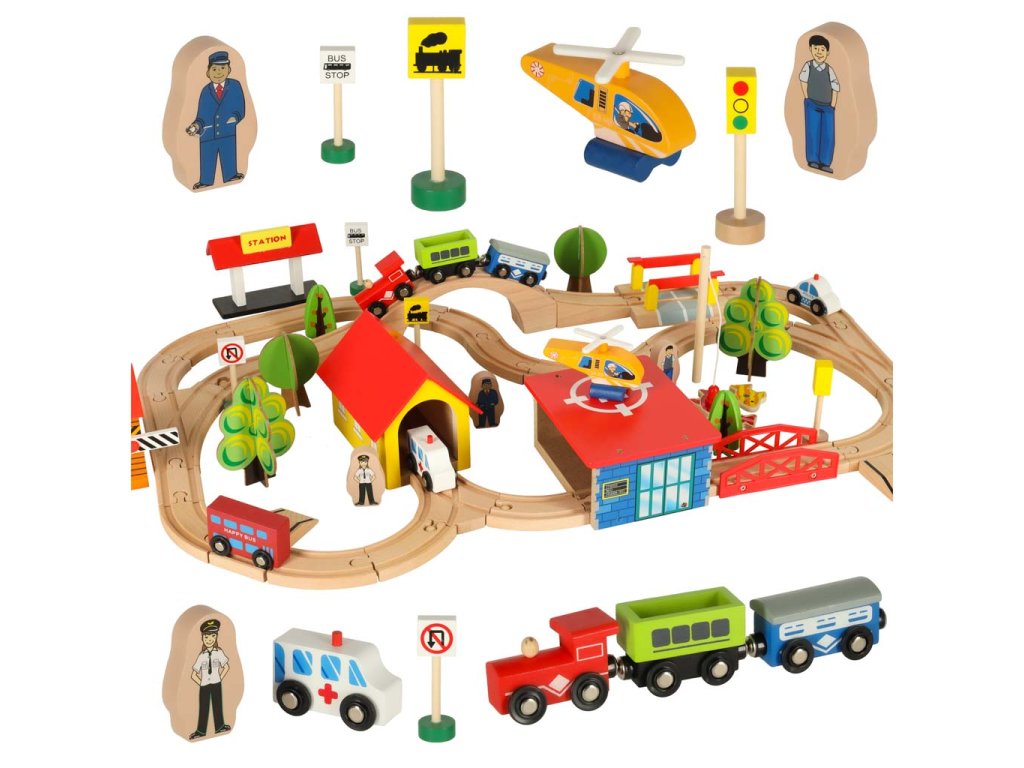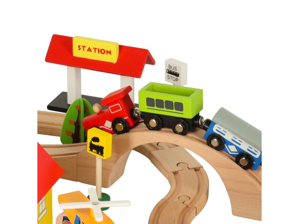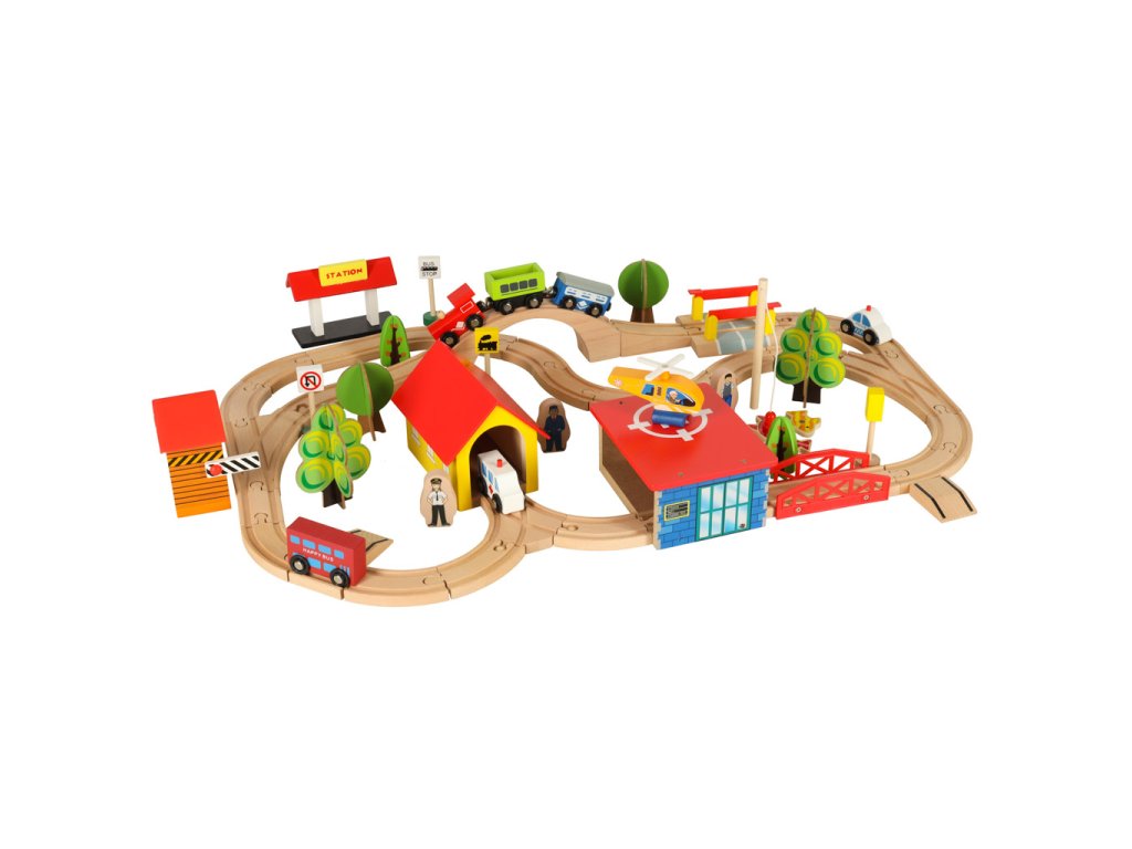 Okrem koľají súprava obsahuje vláčik s vagónmi, autíčkami, budovami, figúrkami a dekoráciami, ktoré môžete ľubovoľne rozmiestniť a vytvoriť si tak vlastné mestečko.