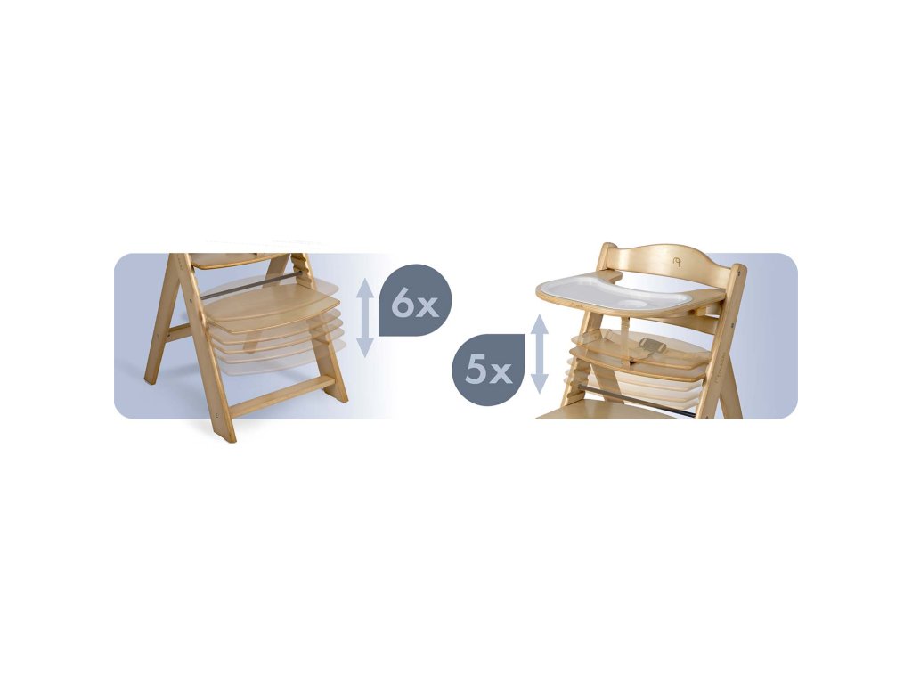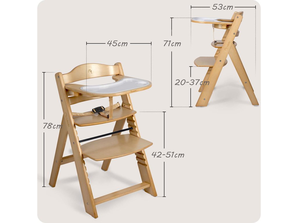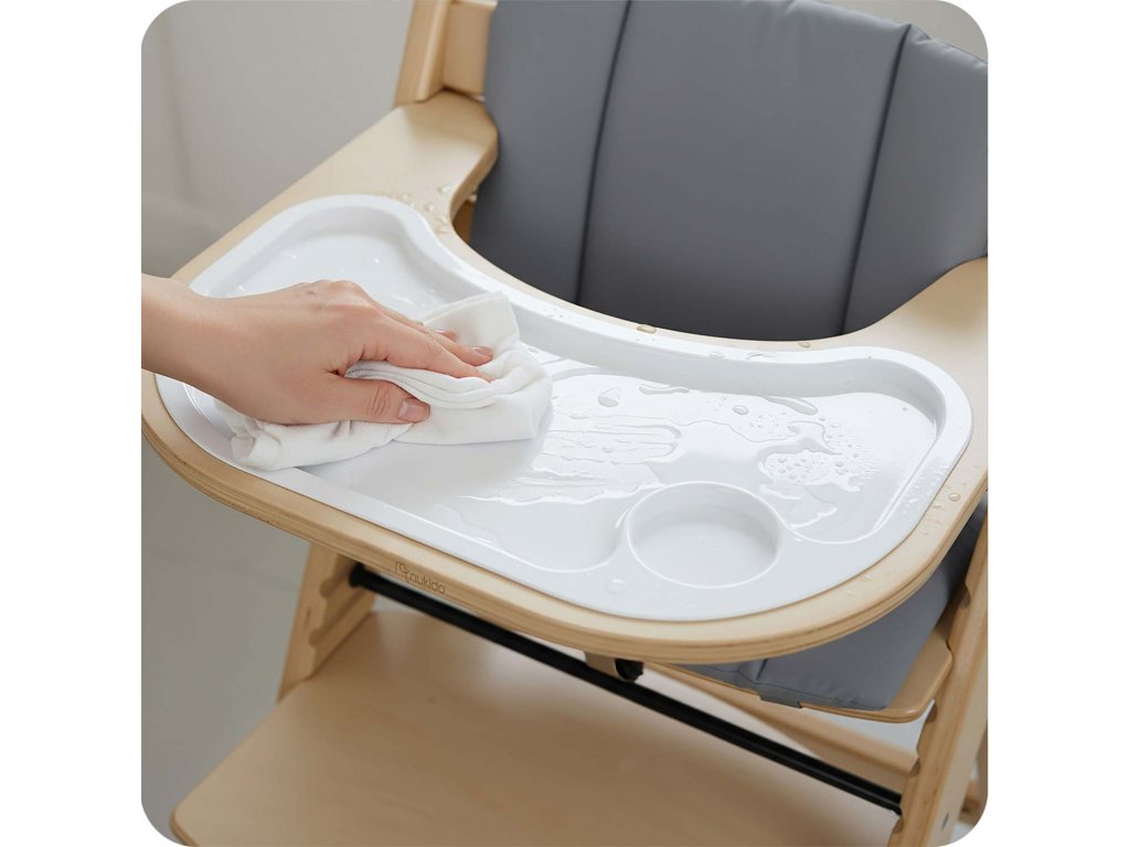 Odnímateľná tácka výrazne uľahčuje udržiavanie čistoty. Lakované topoľové drevo je zárukou kvality. Chránené drevo zabrání vstrebaniu škvŕn a stolička rýchlo vráti do dokonalého čista.
