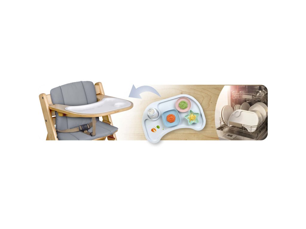 Stolička ponúka možnosť úplného demontáže tácky, keď je dieťa staršie a môže byť priložená priamo ku rodinnému stolu.