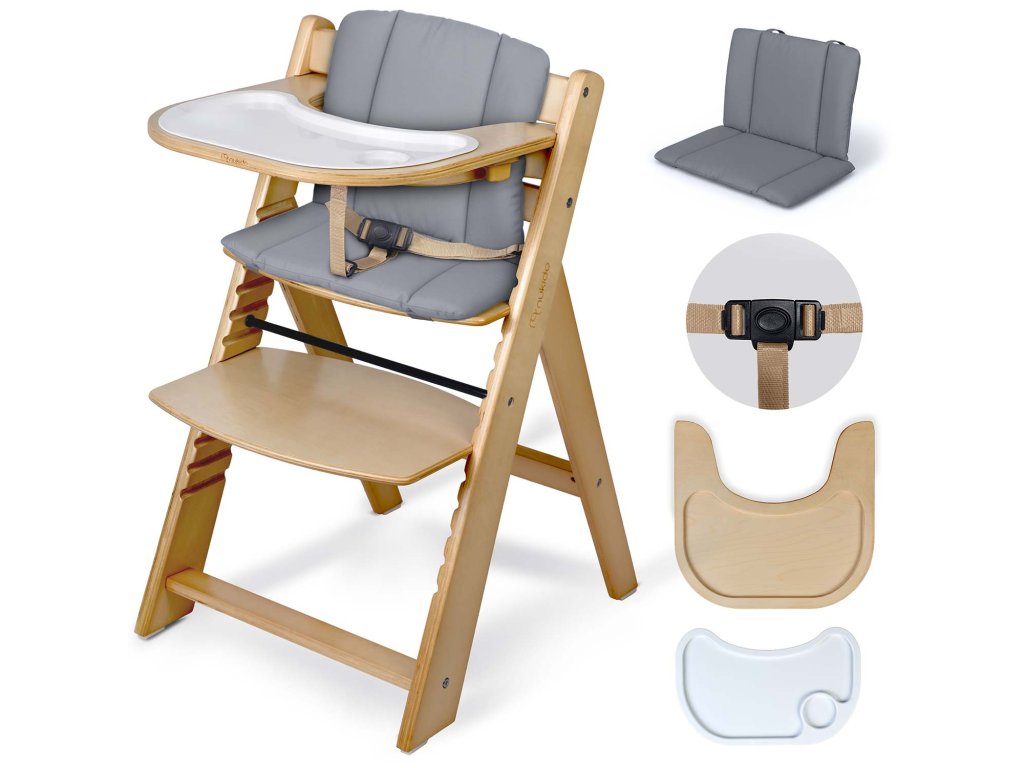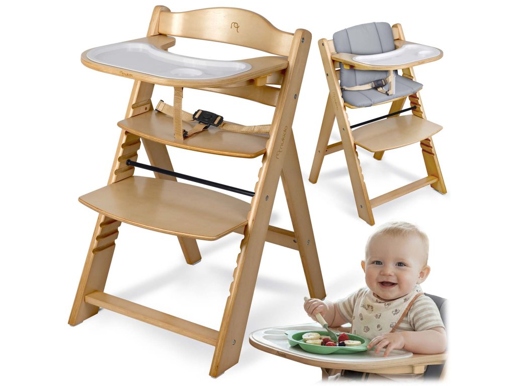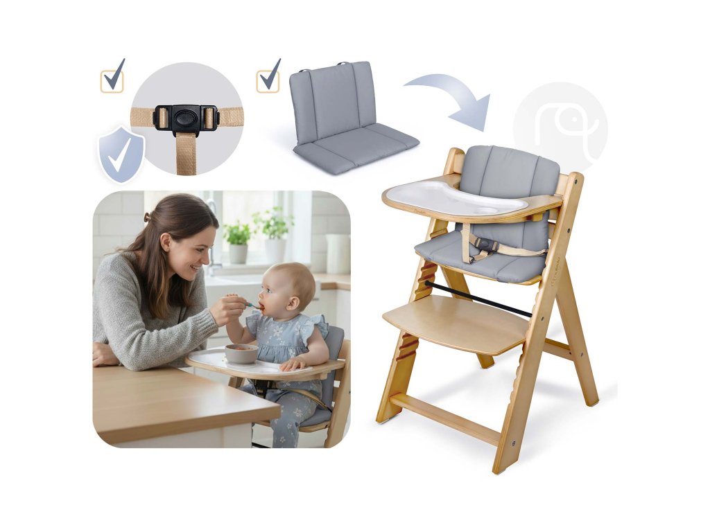 Vďaka špeciálnemu setu s bezpečnostnými pásmi a pohodlným vankúšikom sa stáva bezpečným a komfortným prvým stoličkom pre vaše bábätko. Ideálne na prvé jedlá a spoločné chvíle pri stole.