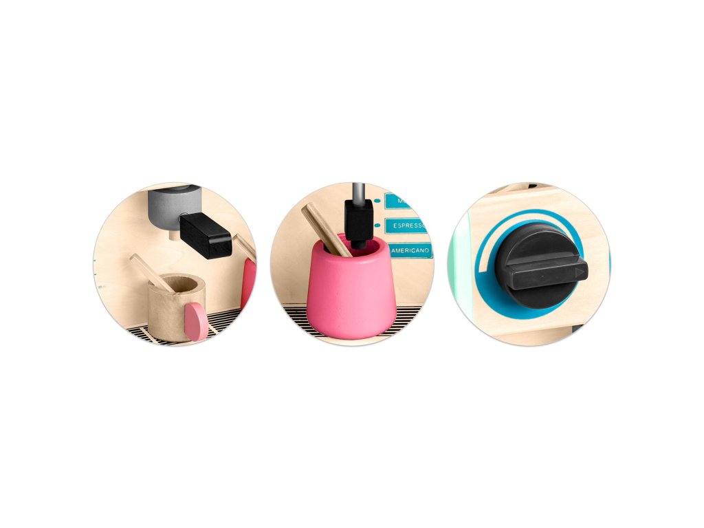 Cukráreň/kaviareň obsahuje početné príslušenstvo: čokoládové sušienky 2 ks, škoricové tyčinky 2 ks, donuty 2 ks, koláčové kúsky 2 ks, fľaša na kávu 1 ks, tyčinky na miešanie 2 ks, šálky 2 ks (s uškom).+ bez ucha).