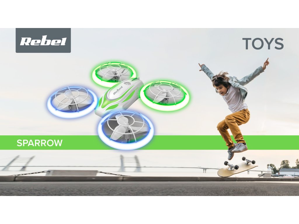 Dron Sparrow zo série Rebel Toys je ideálnym riešením na hranie doma aj na vzdušnú akrobaciu vonku. Funkcionalita zariadenia robí z neho veľa zábavy pre deti aj začiatočníkov.