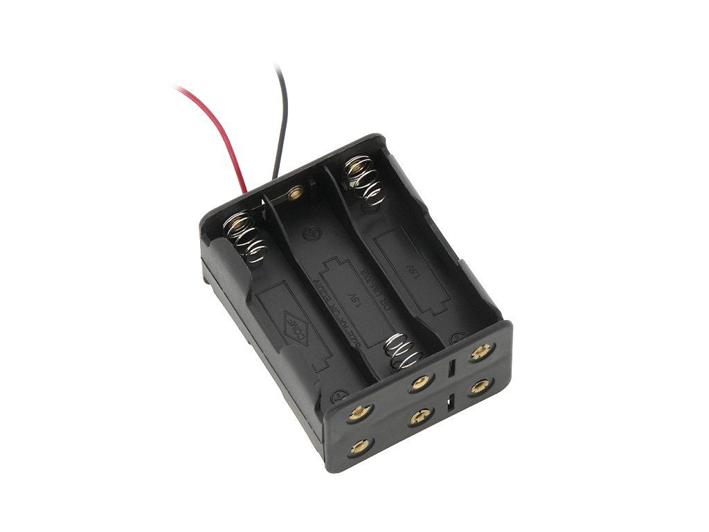 Praktický držiak na batérie určený pre 6 kusov článkov typu R6 (AA). Vďaka vyvedeným montážnym vodičom umožňuje jednoduché zapojenie do elektrických a elektronických zostáv. Je vhodný na stabilné uloženie batérií a prehľadné napojenie na zariadenie alebo obvod.