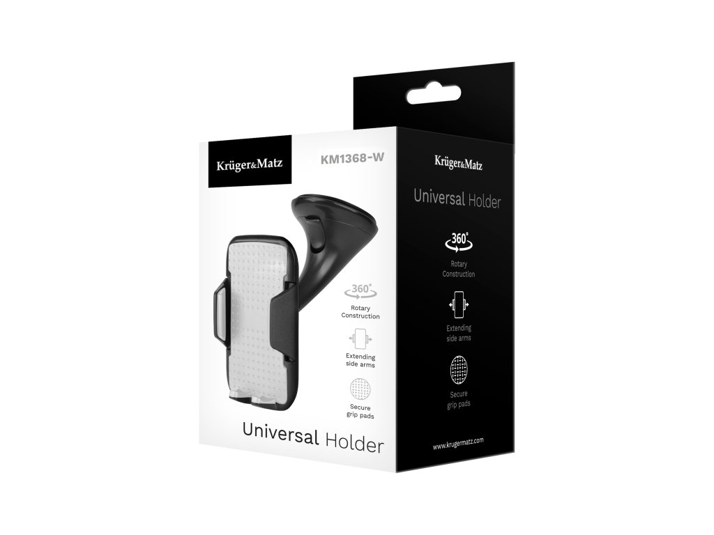 Držiak na smartfón Kruger&Matz je univerzálny a je vhodný pre akýkoľvek telefón so šírkou od 5,5 cm do 8,7 cm. Konštrukcia otočná o 360° vám umožní nastaviť správny uhol pohľadu, zatiaľ čo mäkké vnútorné polstrovanie poskytuje protišmykovú priľnavosť a chráni puzdro vášho zariadenia pred poškriabaním.