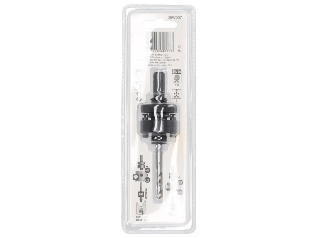 Držiak DEDRA 08W007 je vybavený pilotným vrtákom s priemerom 6 mm, ale treba mať na pamäti, že ako už názov napovedá, vrták má len pilotnú funkciu a mal by sa pohybovať v predtým vyvŕtanej diere. Táto aplikácia zaručuje presnú a zároveň bezpečnú prácu.