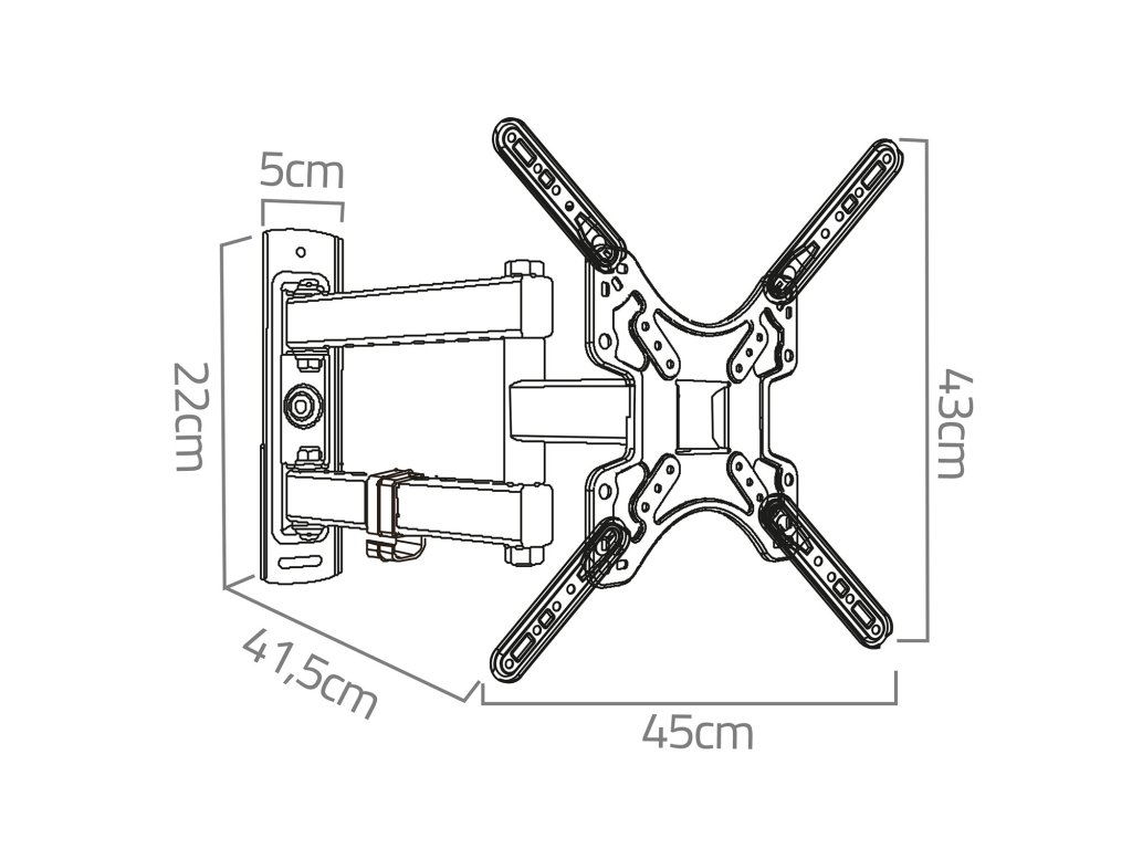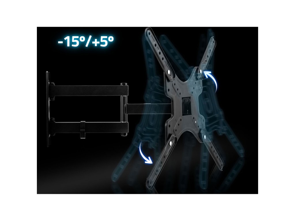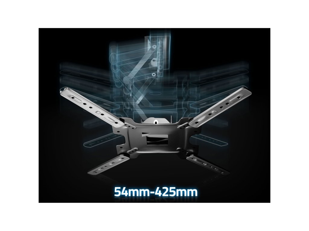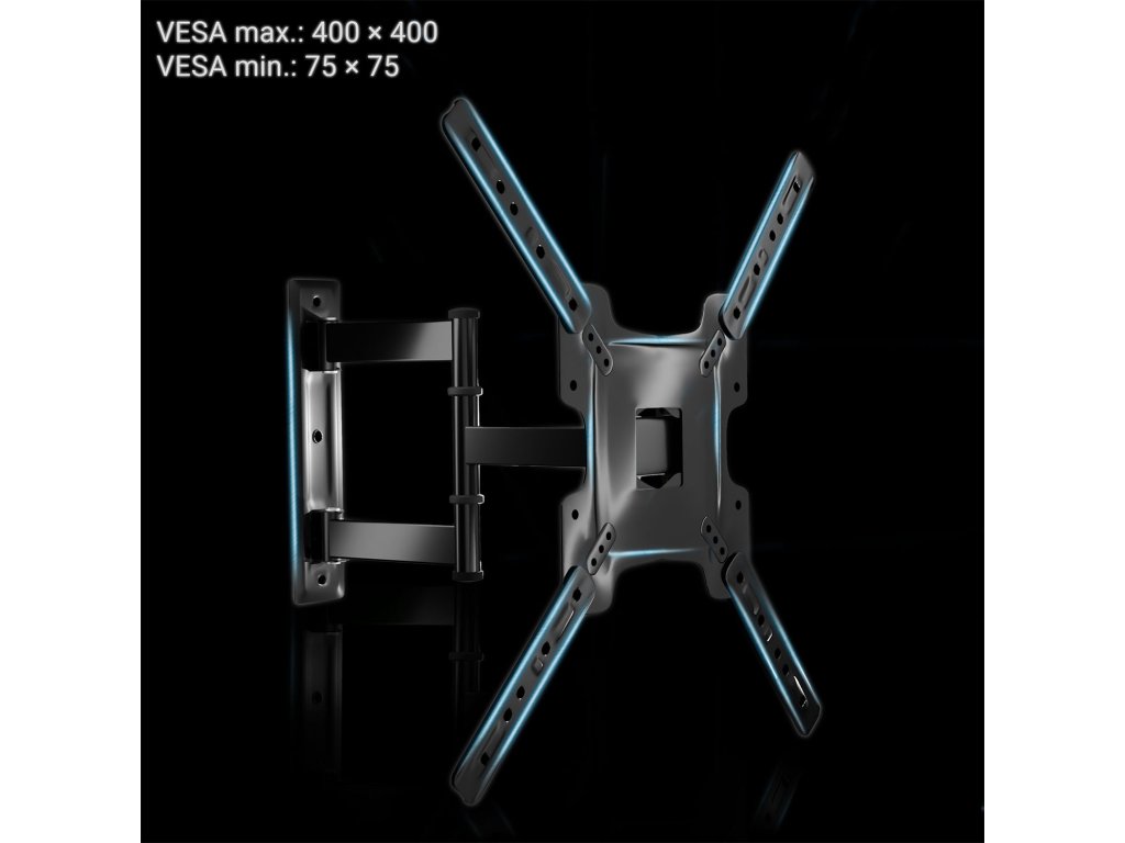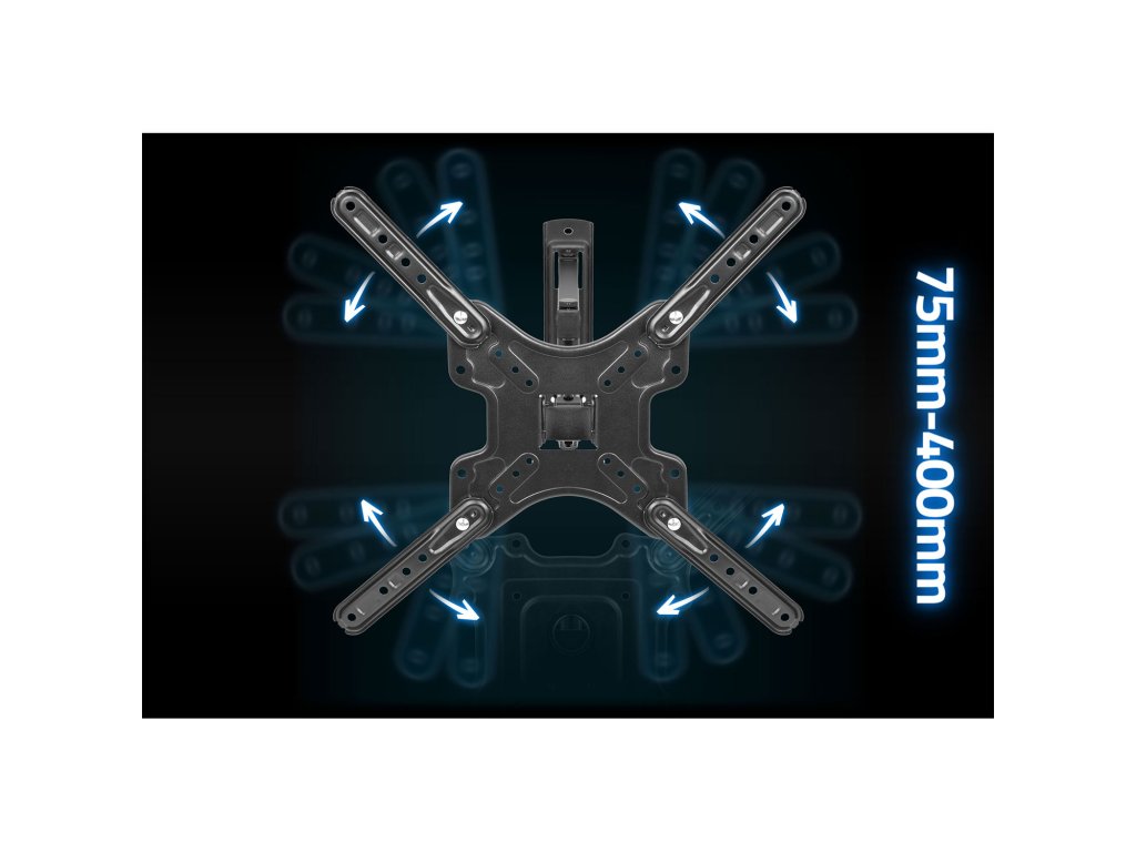 - Nastavenie rozstupu montážnych ramien – prispôsobte držiak štandardu VESA od 75 x 75 do 400 x 400 mm.