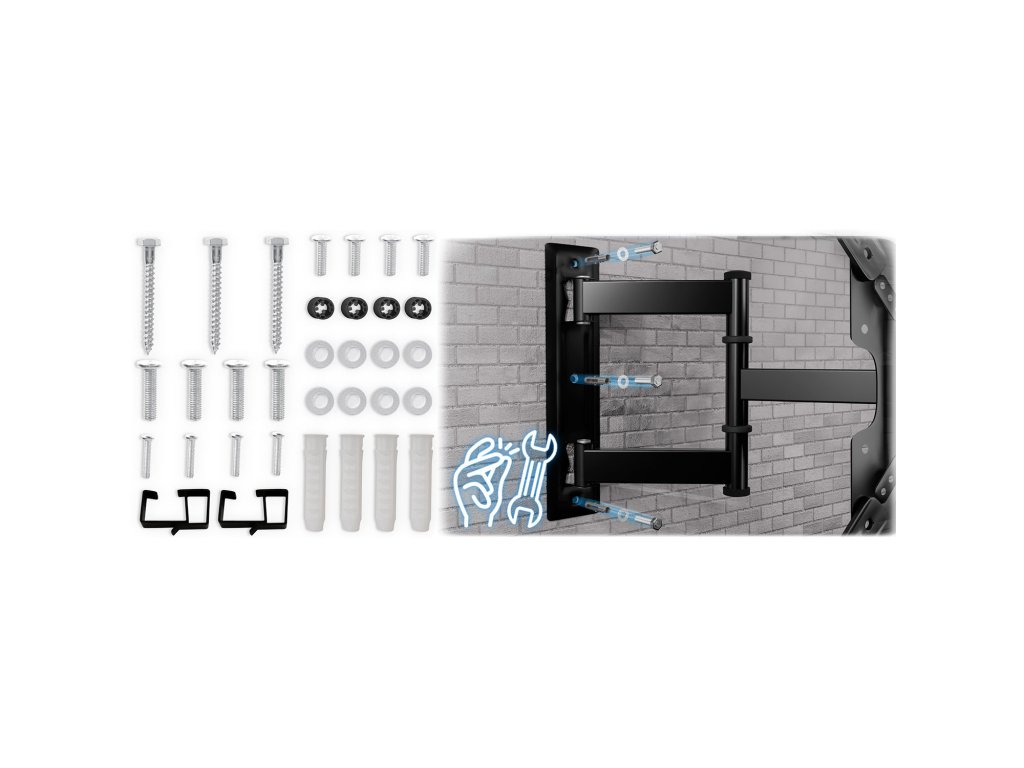 V sade nájdete kompletnú montážnu súpravu — skrutky, hmoždinky, podložky. Držiak je možné namontovať na každý druh steny — betónovú, sadrovú či tehlovú. Montáž je rýchla a jednoduchá, zaberie len chvíľu, aj bez odbornej pomoci.