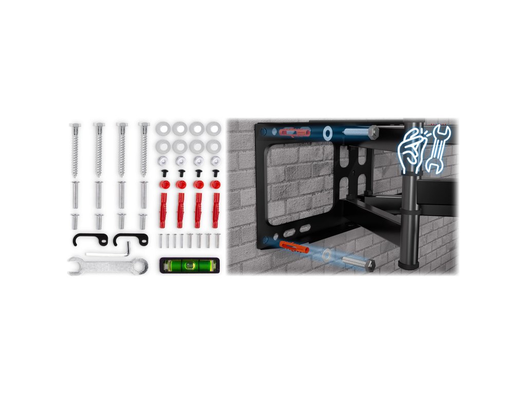 V sade nájdete kompletný montážny komplet — skrutky, kolíky, podložky a nástroje, ktoré uľahčia inštaláciu. Držiak je možné namontovať na akýkoľvek typ steny — betónovú, sadrovú alebo tehlovú. Montáž je rýchla a jednoduchá, zaberie len chvíľu, aj bez špecializovanej pomoci.