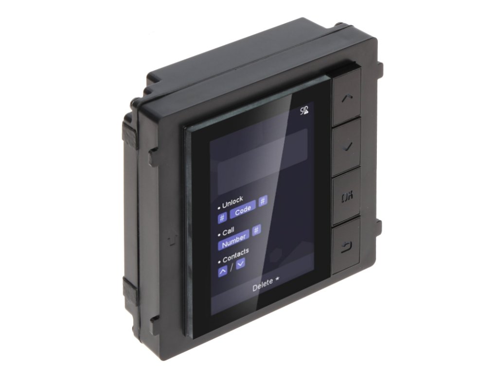 DS-KD-DIS značky Hikvision je LCD modul displeja, určený pre IP video interkom. Zariadenie má integrovaný displej 3,5" a 4 fyzické tlačidlá, umožňujúce vyvolanie bytu zo zoznamu kontaktov prezentovaných na displeji. Zariadenie môže tiež slúžiť ako displej pre čísla volané pomocou klávesnice DS-KD-KP. Celý modul je uzavretý v štýlovom, odolnom puzdre, vyrobenom v triede odolnosti IP65.