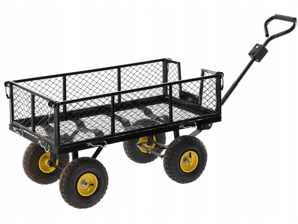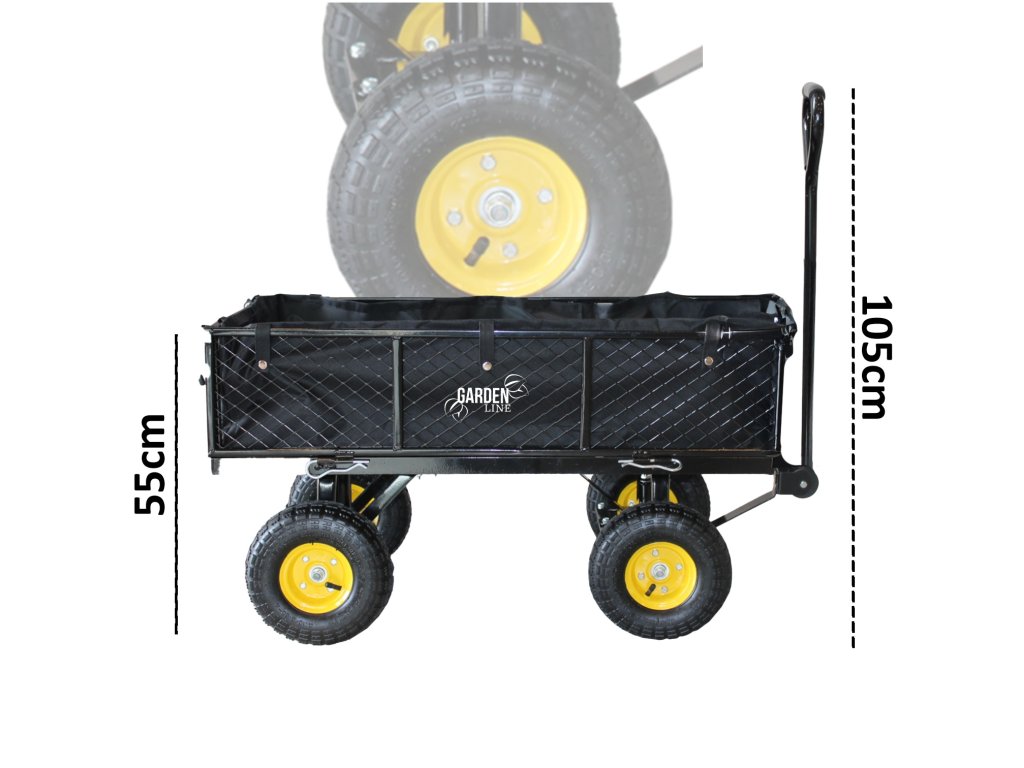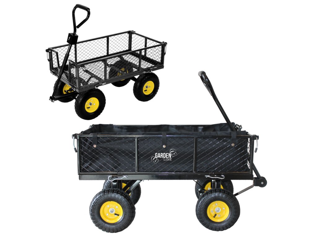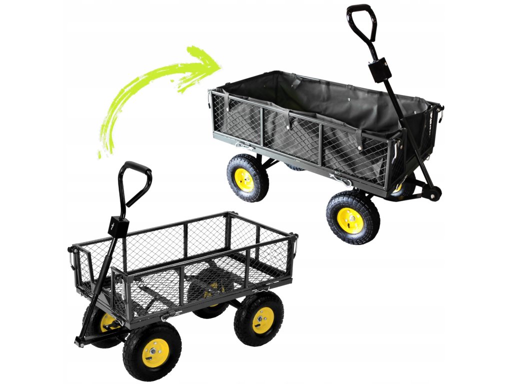 Dvojfunkčný záhradný vozík v zelenej farbe, určený na prevoz ľahkých a ťažkých nákladov do 300 kg, nástrojov a rôznorodého tovaru. Vybavený nafukovacími kolesami s dezénom, protišmykovou rukoväťou a otočnou osou umožňujúcou otáčanie až do 180°, čo robí prácu s vozíkom jednoduchou a pohodlnou.