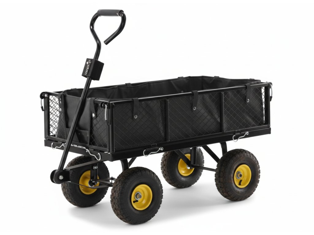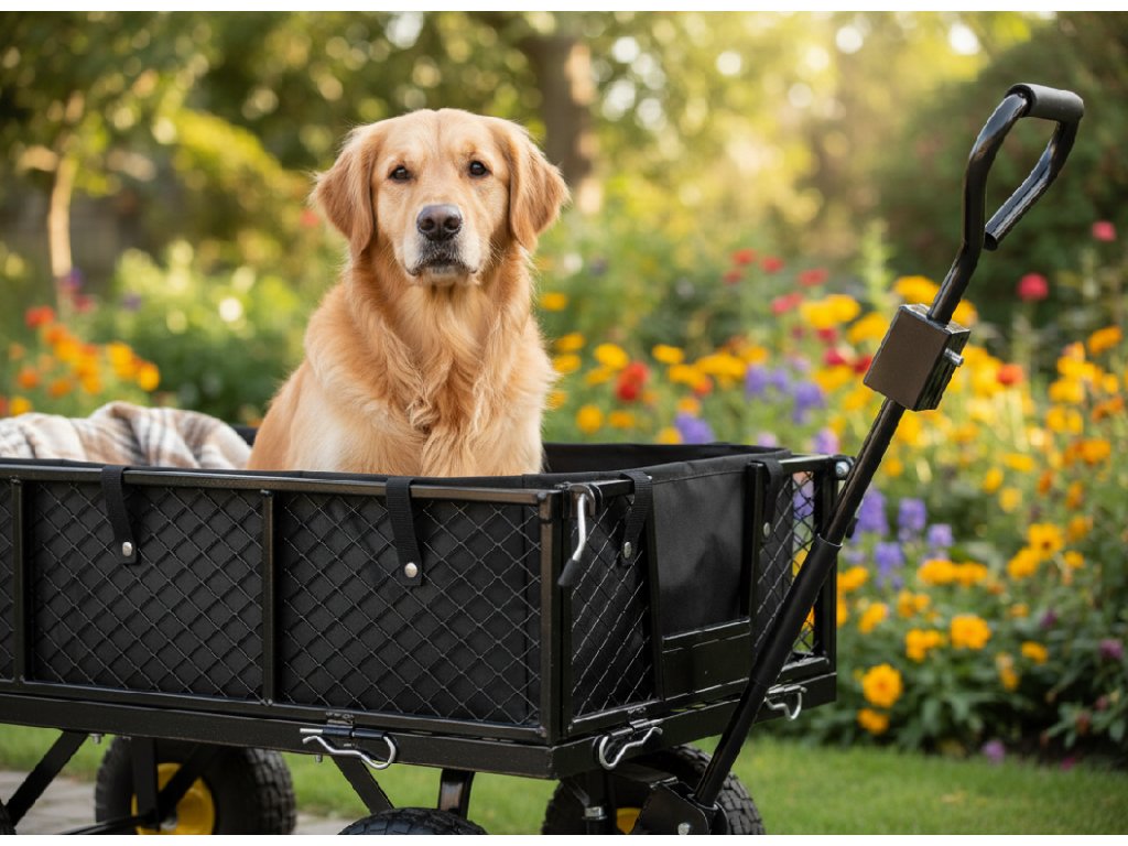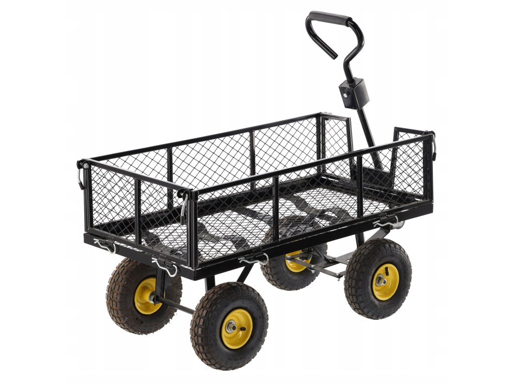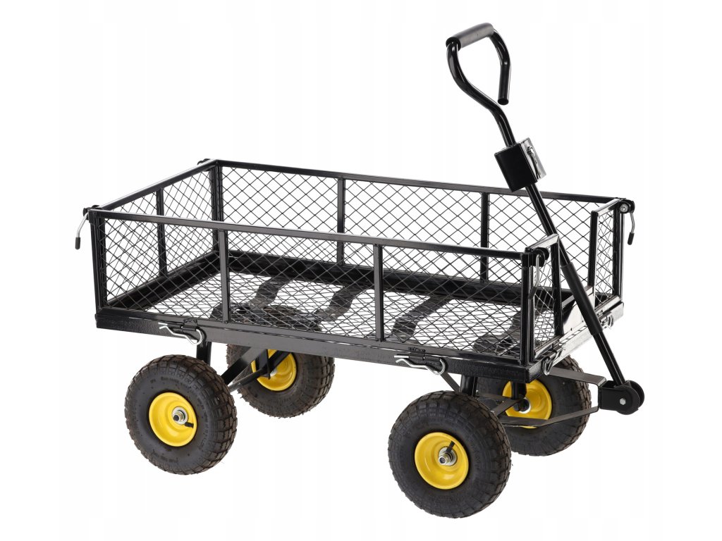 Dvojfunkčný záhradný vozík v zelenej farbe, určený na prevoz ľahkých a ťažkých nákladov do 300 kg, nástrojov a rôznorodého tovaru. Vybavený nafukovacími kolesami s dezénom, protišmykovou rukoväťou a otočnou osou umožňujúcou otáčanie až do 180°, čo robí prácu s vozíkom jednoduchou a pohodlnou.