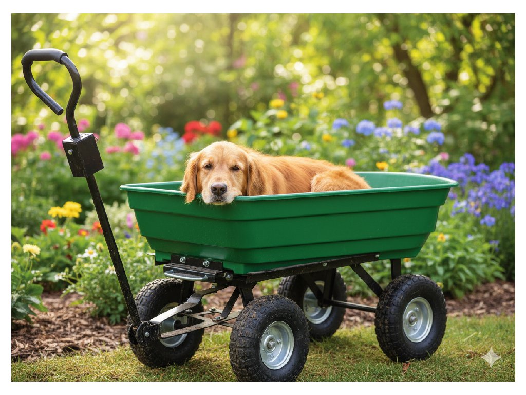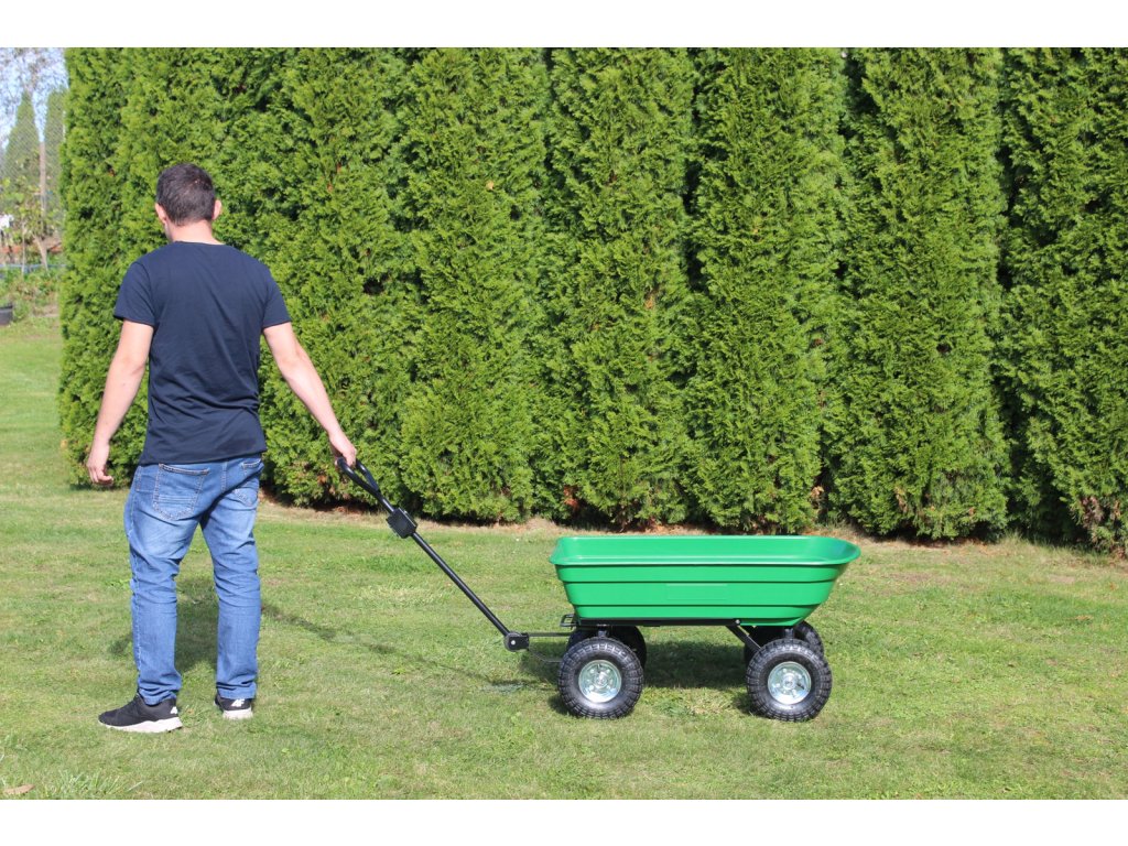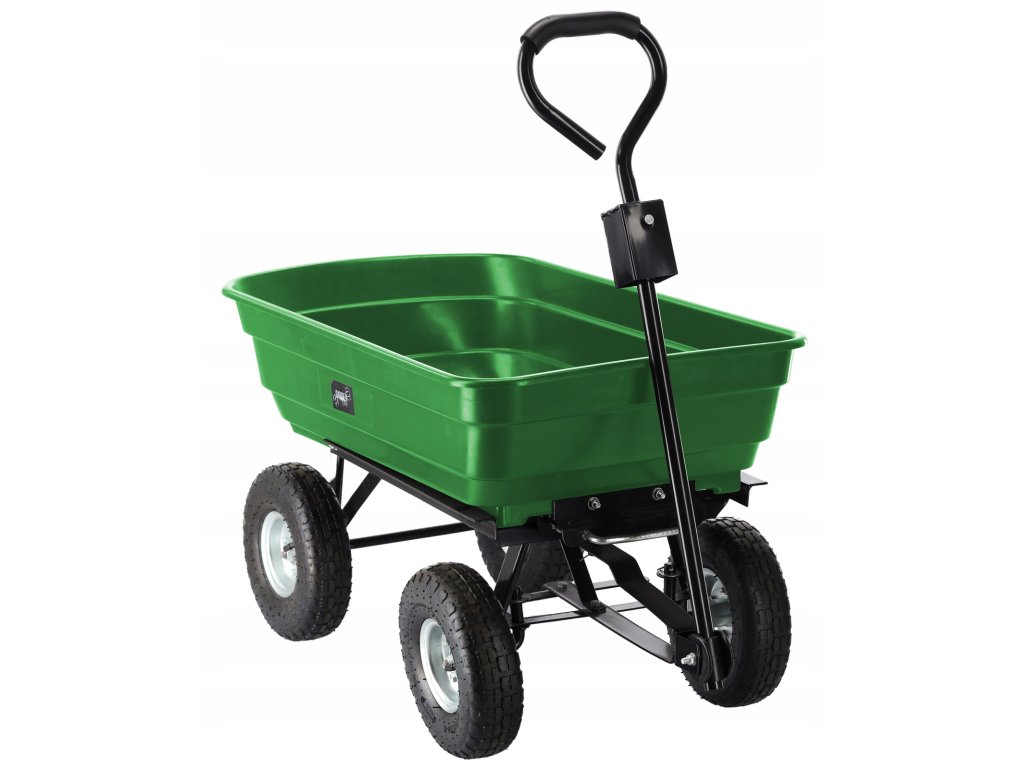 Dvojfunkčný záhradný vozík v zelenej farbe, určený na prepravu nákladov do 300 kg. Vybavený pevnými kolesami, trvanlivými materiálmi a pohodlnou rukoväťou, ideálny na prácu v záhrade a nielen tam.