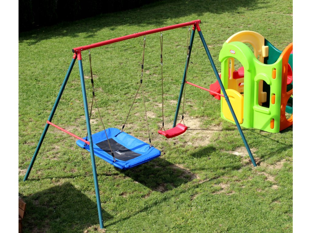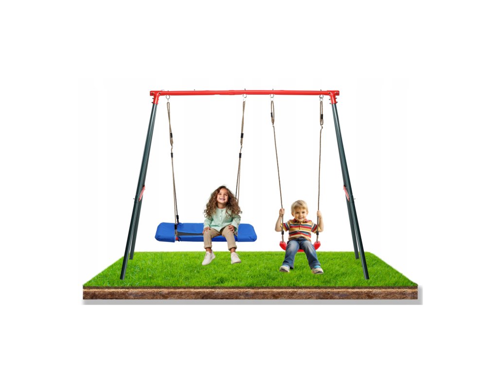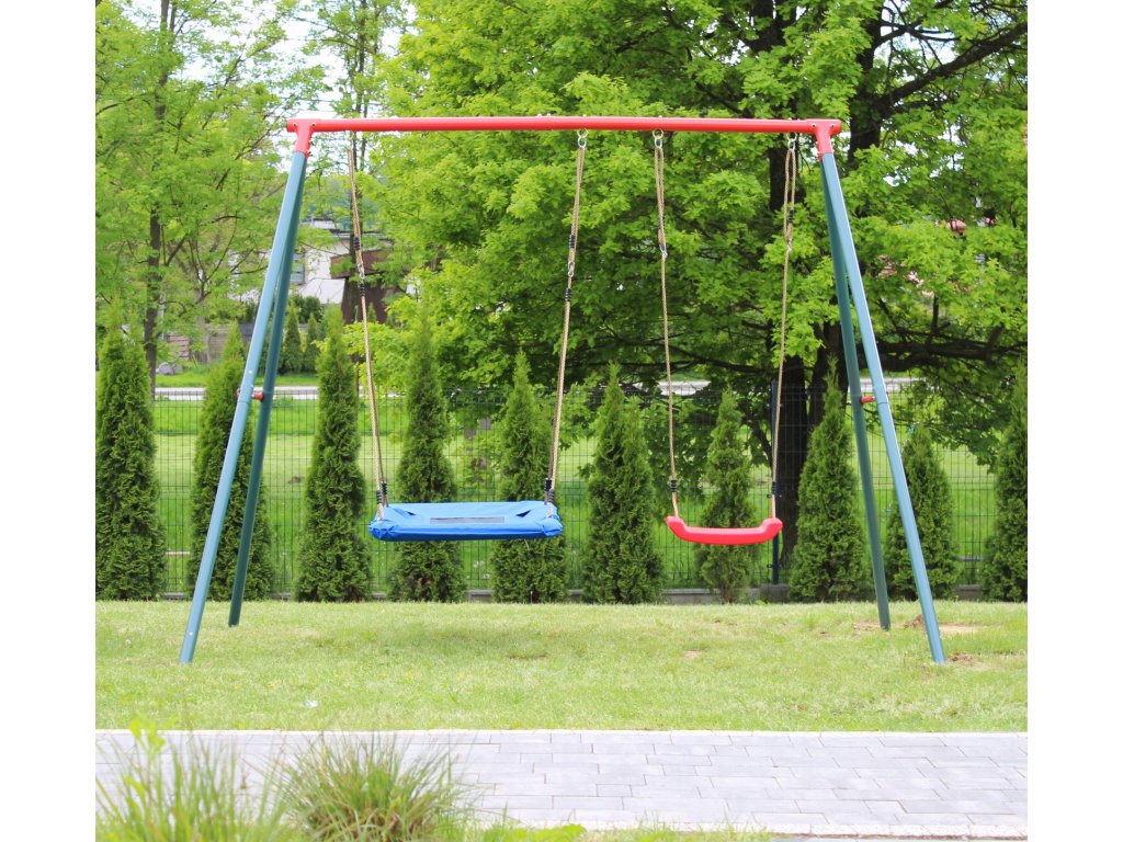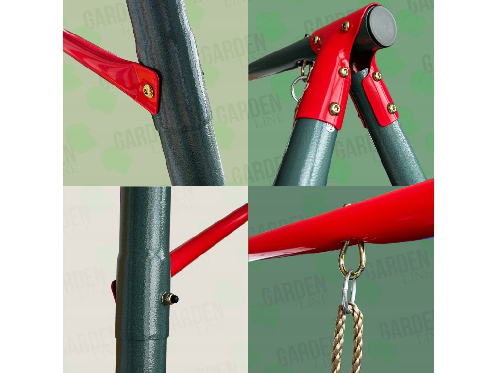 Záhradná hojdačka je ideálnym záhradným nábytkom, ktorý vám umožní oddýchnuť si a relaxovať po náročnom dni. Bude skvelým doplnkom každej záhradky alebo terasy. Možnosť hojdať sa počas relaxácie na čerstvom vzduchu spôsobí, že na nej strávime dlhé hodiny. Konštrukcia vyrobená z kovových rúrok rôznych priemerov, zaisťujúca trvanlivosť a bezpečnosť. Vybavená klasickým červeným sedadlom a modernou, modrou hojdačkou hniezda, ktoré sú veľmi pohodlné na používanie.