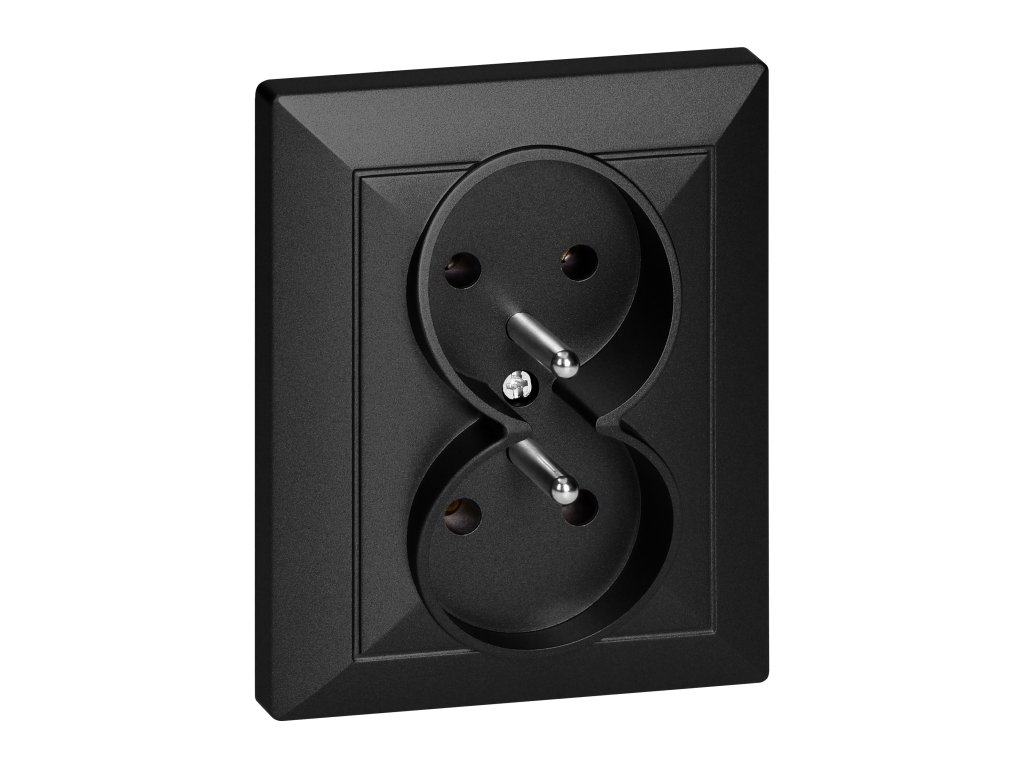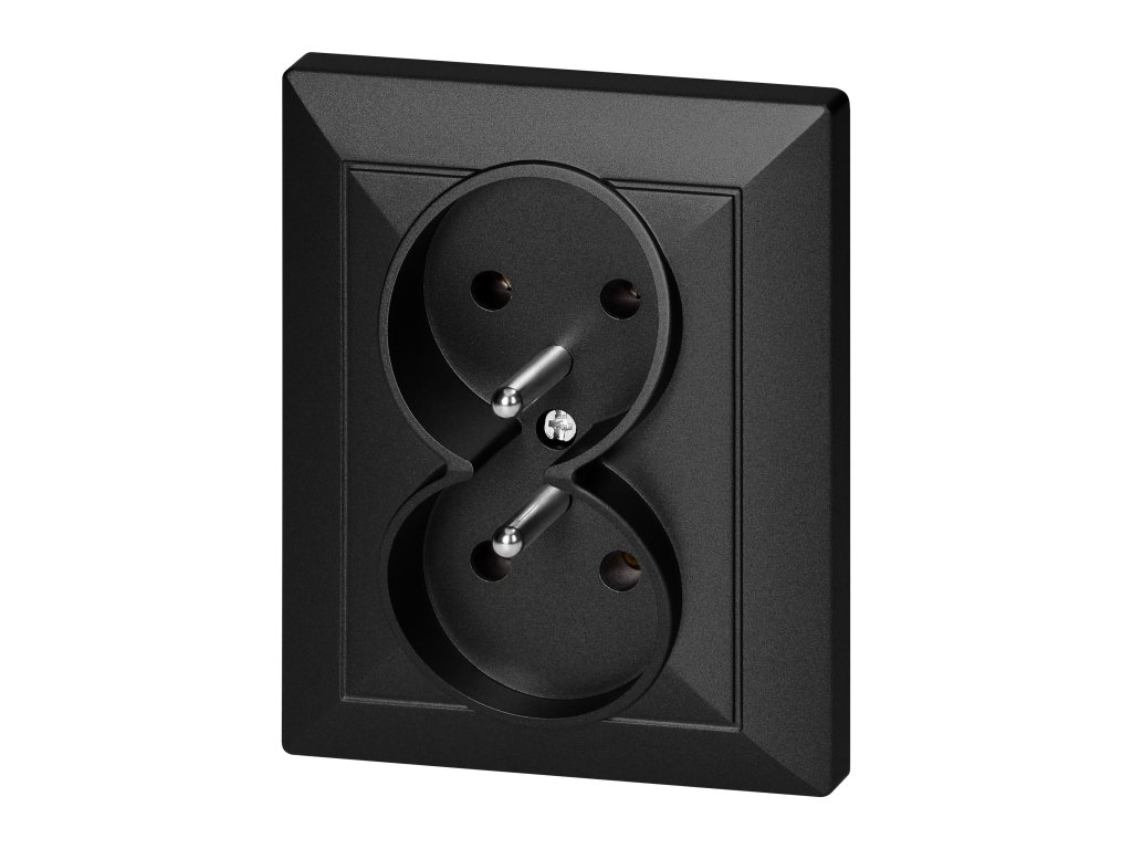 Modulárny rad so symetrickým systémom rámových dosiek (pre 1-, 2-, 3-, 4-, 5-modulové) umožňujúci montáž produktu v horizontálnej aj vertikálnej polohe. Moderný rýchlo-pripájací mechanizmus (káble sa pripájajú zatlačením priamo do telesa) poskytuje bezpečnú a spoľahlivú inštaláciu a odstránenie káblov. Zásuvky sú vybavené tradičnými skrutkovými spojmi. Vnútorná konštrukcia svoriek zaručuje bezpečné pripojenie káblov od 0,75 mm? do 2,5 mm?. Silná a robustná montážna mriežka a vysokokvalitné samovraťné prvky umožňujú stabilnú a bezpečnú inštaláciu v krabici. Špeciálne pružinové prvky uľahčujú upevnenie rámu do telesa.Dvojitá francúzska zásuvka, 2x2P+E. Navrhnuté pre zapustenú montáž. Mala by sa používať v interiéri (IP20).
